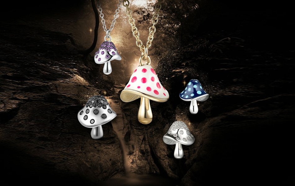 Il y a quelques semaines, en flânant dans les rues de Genève, j’ai découvert de drôles de petits champignons qui poussaient en grand nombre dans une vitrine. S’inspirant du livre Alice aux Pays des Merveilles de Lewis Carroll, et en particulier du film de Tim Burton, Shawish, marque joaillère encore toute jeune, a créé ces petits végétaux qui semblent, très justement, s’être évadés d’un conte de fée!