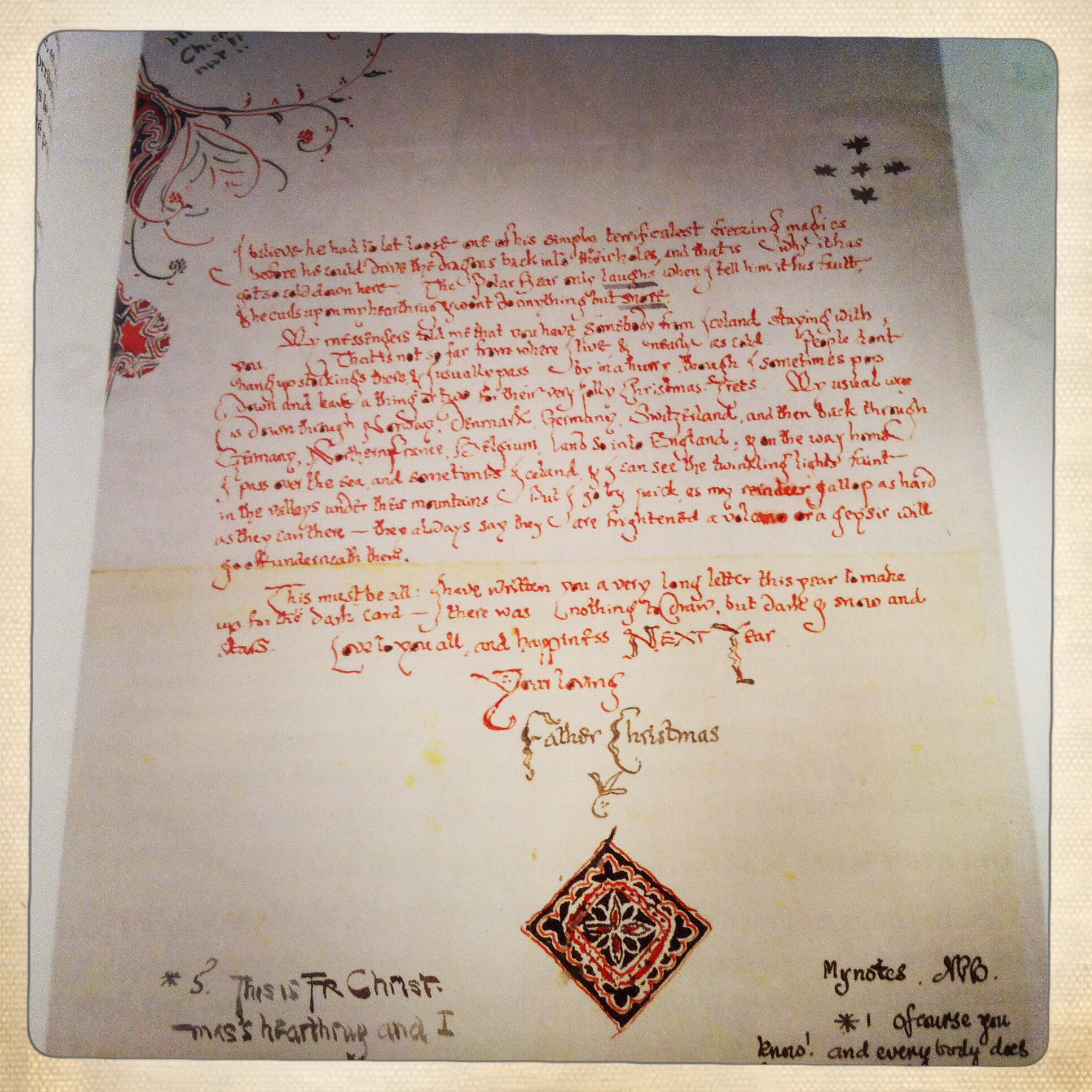 Tolkien a donc rédigé ces lettres, au nom du père Noël, de 1920 à 1942. La première fut livrée lorsque, John, son premier fils avait 3 ans. Pendant plus de 20 ans, elle continuèrent à arriver à Noël pour le plus grand bonheur de ses trois autres enfants: Michael, Christopher et Priscilla. Les enveloppes saupoudrées de neige et portant les timbres de la poste polaire racontent les aventures du Père Noël et de ses compagnons, l’Ours Polaire et ses neveux Paksu et Valkotukka, ou de l’elfe Ilbereth.
