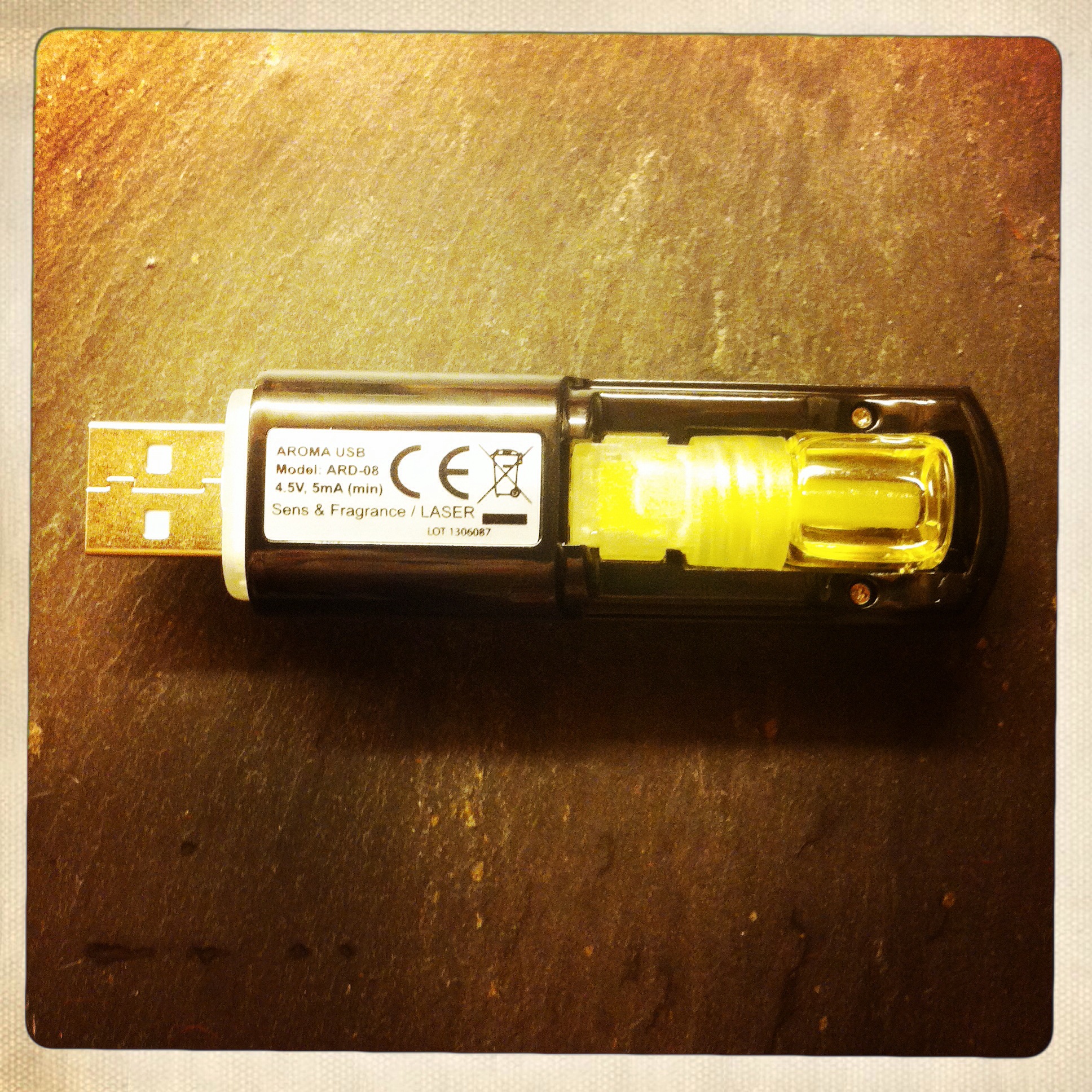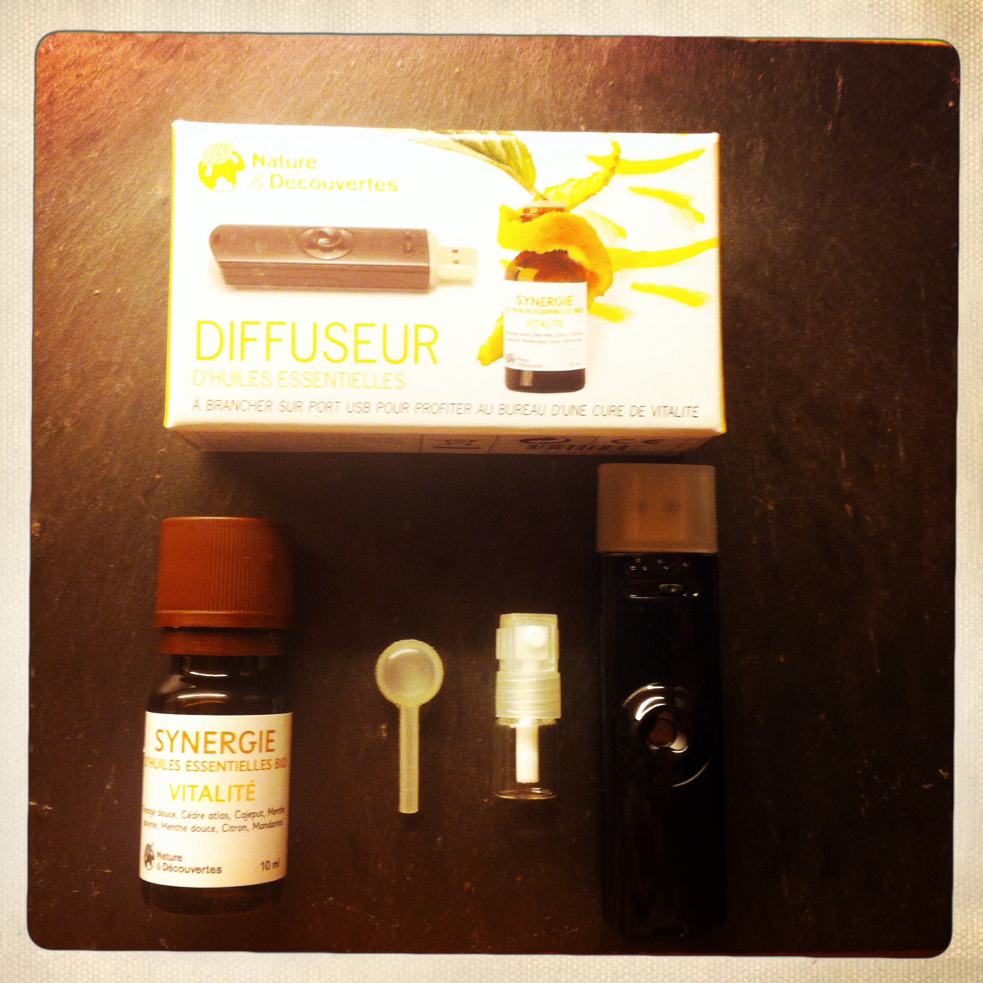 Alors? Comment tenir cette bonne résolution? La magasin Nature et Découverte propose différents diffuseurs d’huiles essentielles, mais j’ai choisi de vous présenter le plus compact, tellement petit qu’il se glisse dans une poche! Ce diffuseur a le format d’une clé USB et se branche comme telle sur votre ordinateur.