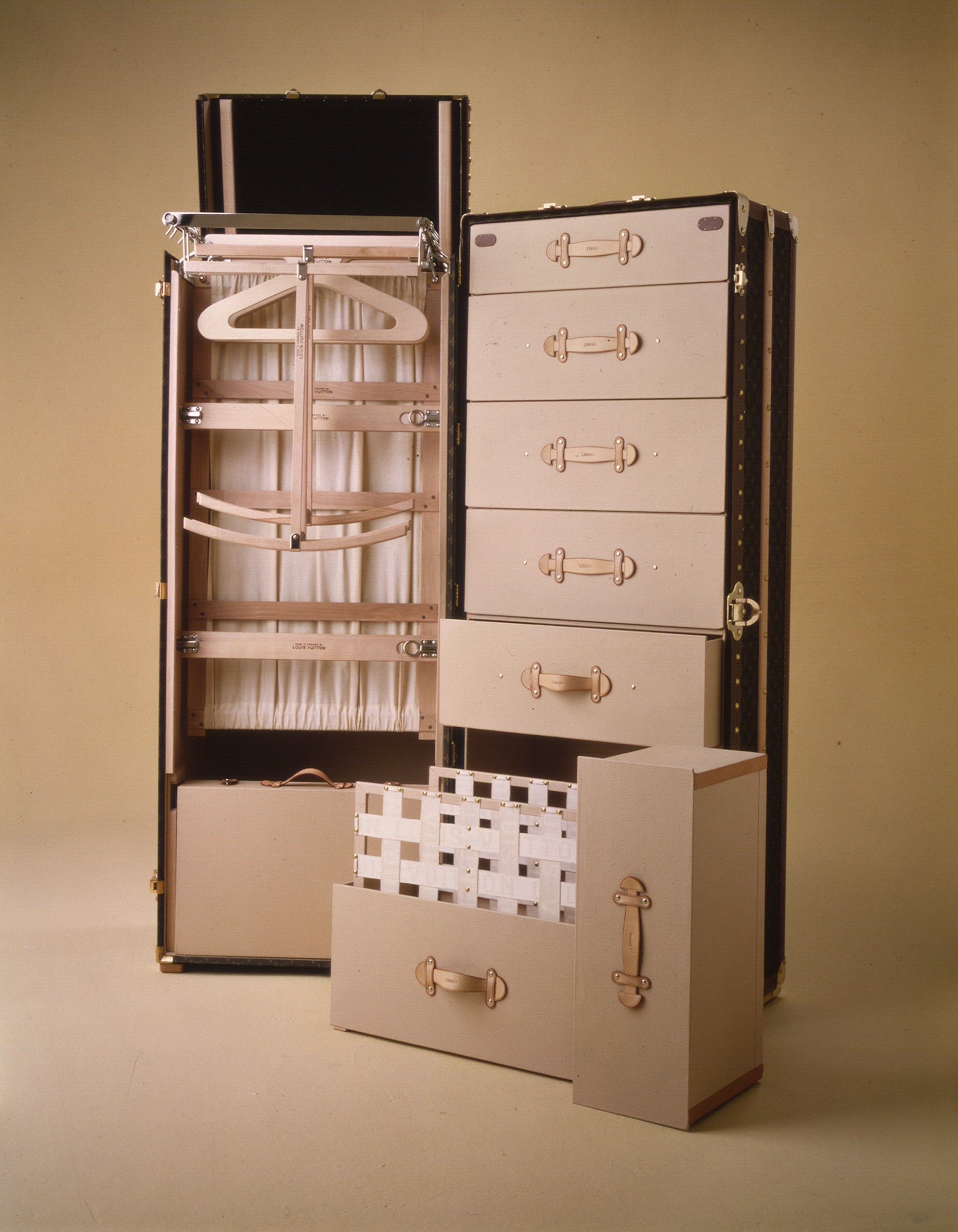 En 1875, Louis Vuitton crée son premier Wardrobe, ou armoire garde-robe, pour répondre aux attentes des grands voyageurs. D’un côté, on trouve une penderie et dans l’autre porte des casiers qui permettent de tout ordonner. De nombreuses variantes seront imaginées pour satisfaire toutes les exigences! Le luxe de la malle sera poussé à l’extrême.