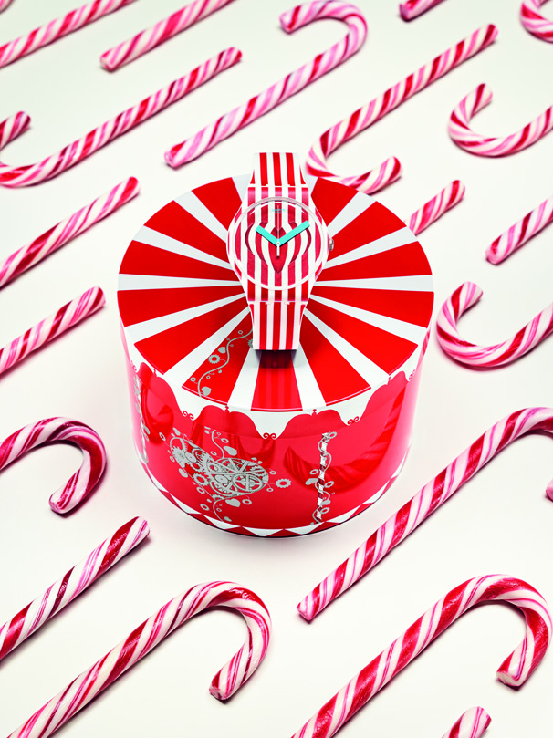 Pour célébrer en beauté cette fête, la Maison Swatch présente une création qui réunit presque toutes ces icônes de l’amour en une montre: du rouge pour la passion, des sucres d’orge pour la douceur et un gros cœur pour marquer le temps de l’amour et être au poignet de votre promise tout au long de l’année!