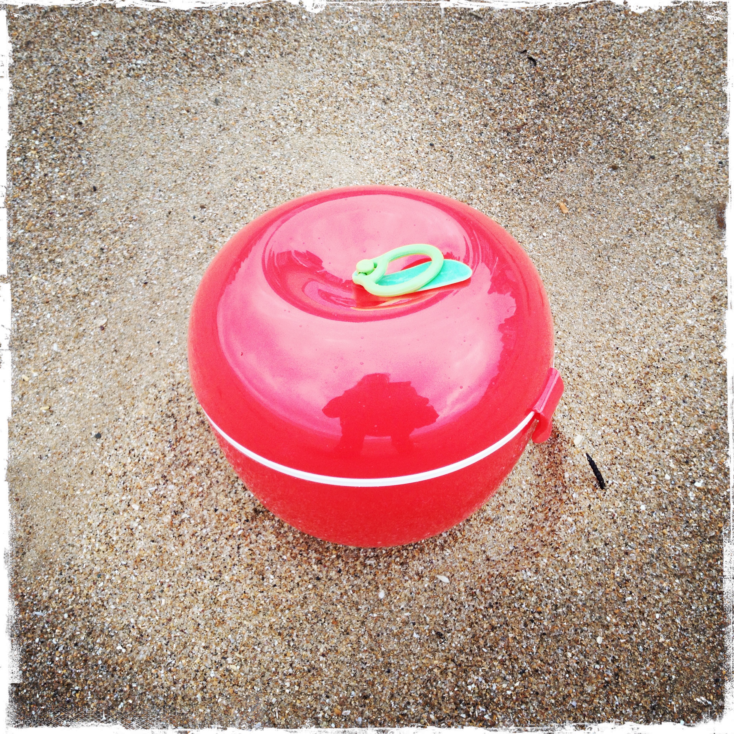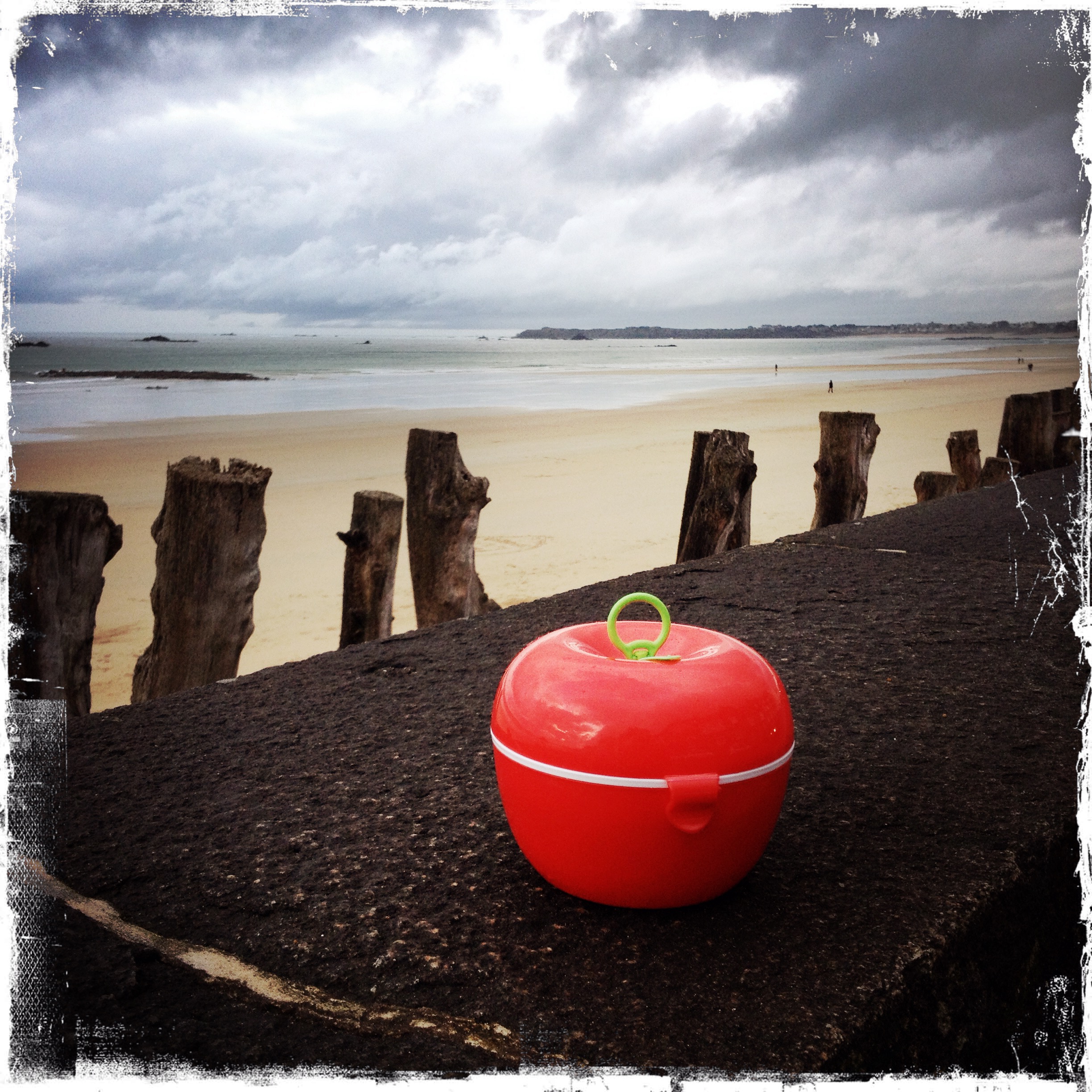 Bref, j’ai découvert le week-end passé cette lunch box en forme de pomme et j’ai décidé de tester son étanchéité! Et hop, la lunch box avec salade et sauce dans le sac à main et direction l’aéroport! Eh oui! Je suis une téméraire, mais le résultat est là: tout est resté dans la pomme et du coup, je l’ai promené à Saint-Malo du côté de la plage et de la Vieille-ville, mais vide cette fois, m’étant régalée de ma salade à l’aéroport!
