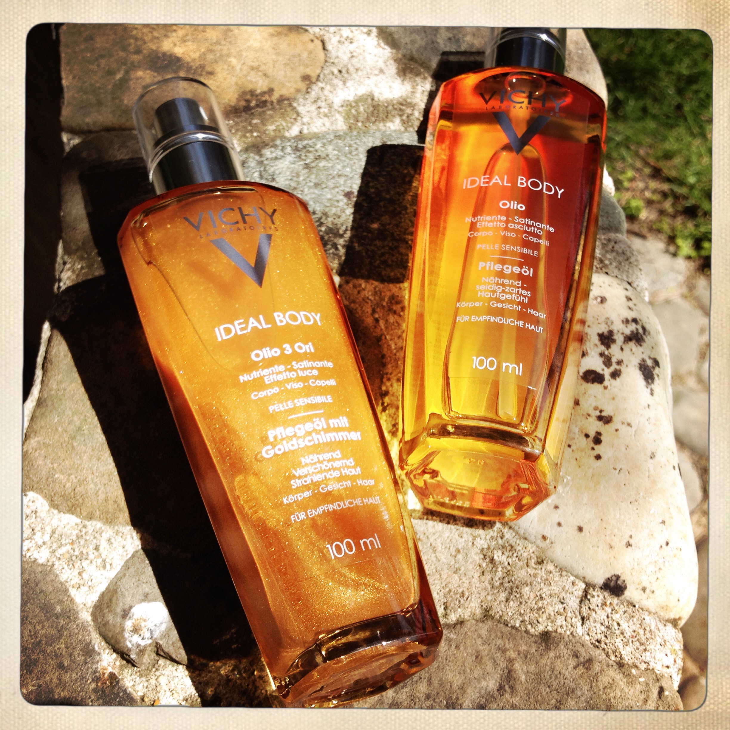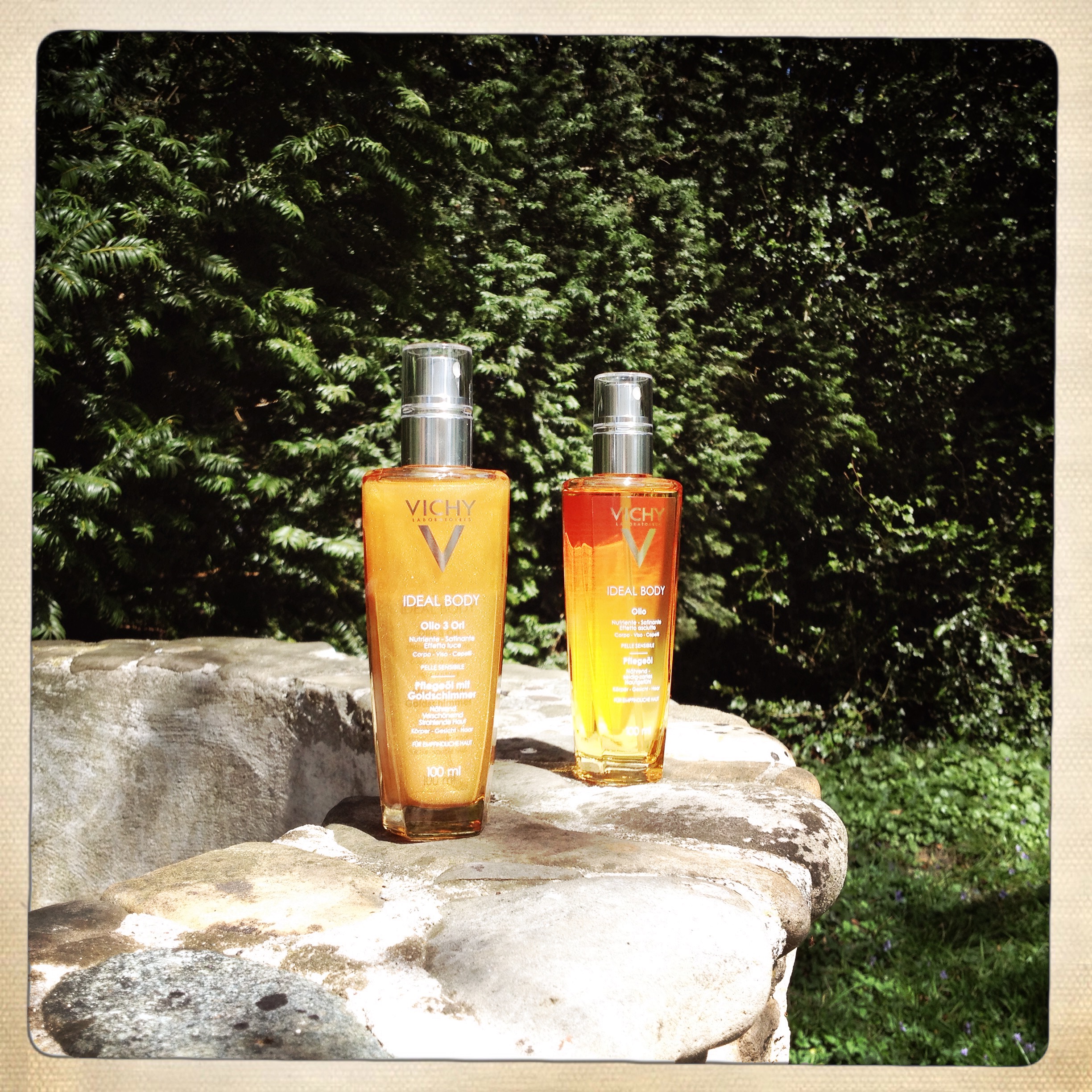 Passer de 10° à 30°C sans transition, c’est bien une particularité helvétique! Et quand il fait chaud, on fait quoi?? On prend un tas de douches! Mais après une bonne douche, je trouve pénible de mettre de la crème, en particulier quand il fait chaud! Il faut que ça trotte! Pas le temps d’attendre que la crème veuille bien pénétrer! Donc en été, je favorise l’huile pour ma peau qui est moins sèche. Aujourd’hui, je vous présente deux variations lipidiques de Vichy: les huiles Ideal Body!