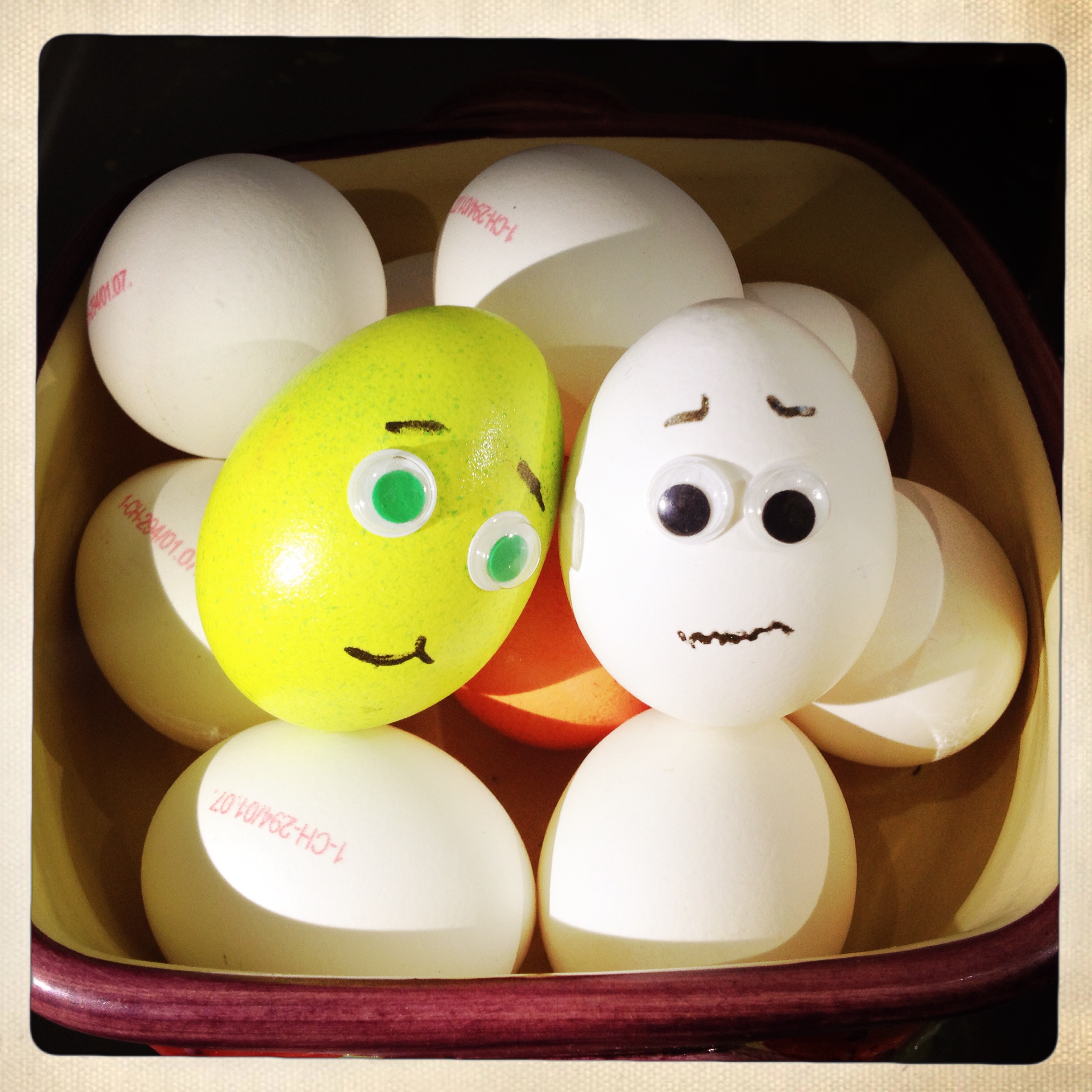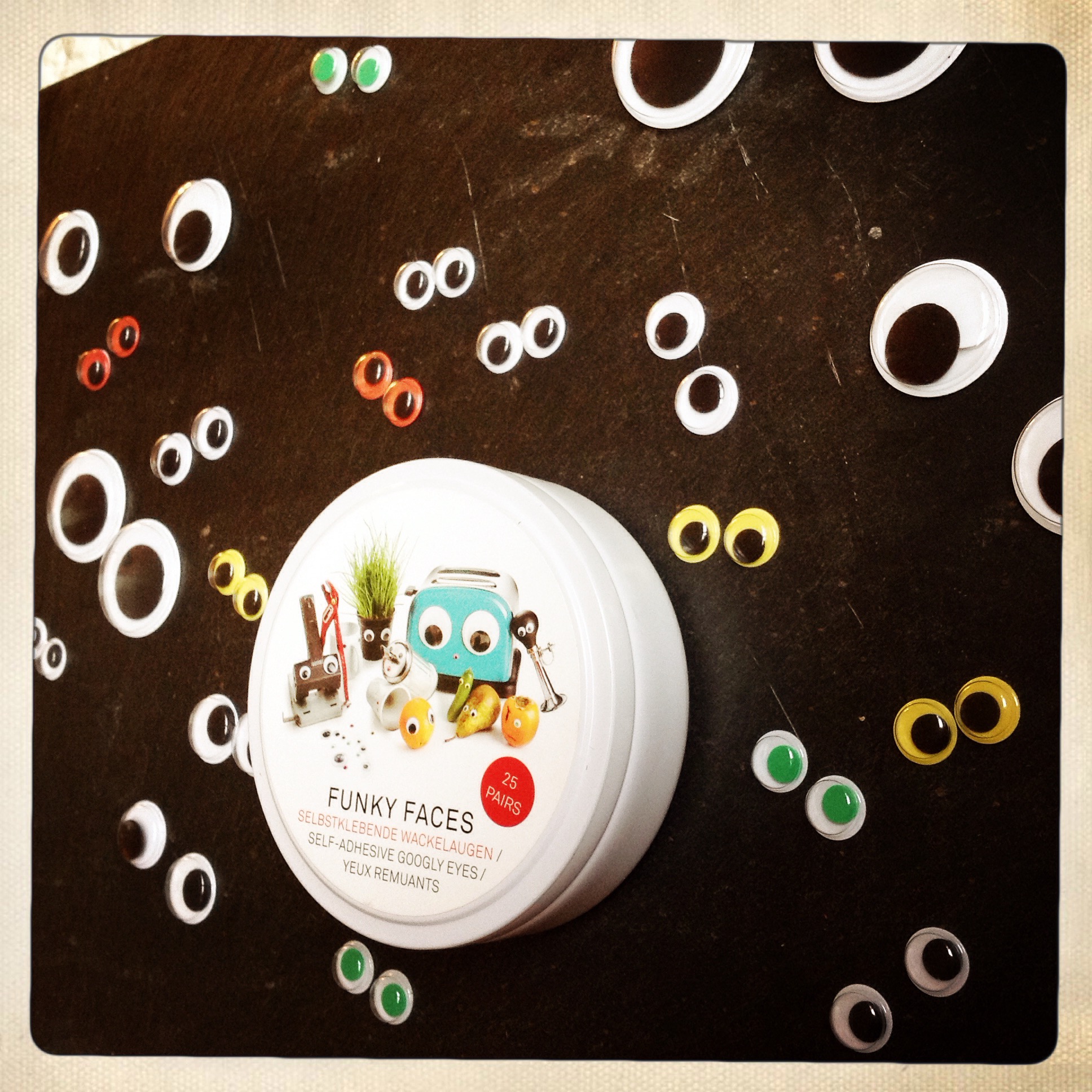 Dans la petite boite se trouvent une vingtaine de paires de yeux: des grands, des petits, des noirs, des rouges, des verts… A l’arrière des yeux, un autocollant permet de les fixer sur toutes les surfaces!
