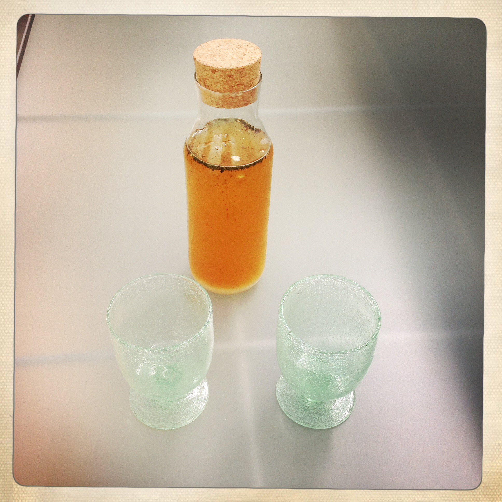 Après deux heures, il s’agit de récupérer le rhum macéré pour le mélanger à un litre d’eau gazeuse. Les ingrédients séchés ont pompé beaucoup de rhum, il m’a semblé en avoir perdu pas mal. D’où mon commentaire précédant: je pense qu’il est plus pertinent de verser l’eau gazeuse dans le mélange et de le filtrer ensuite!