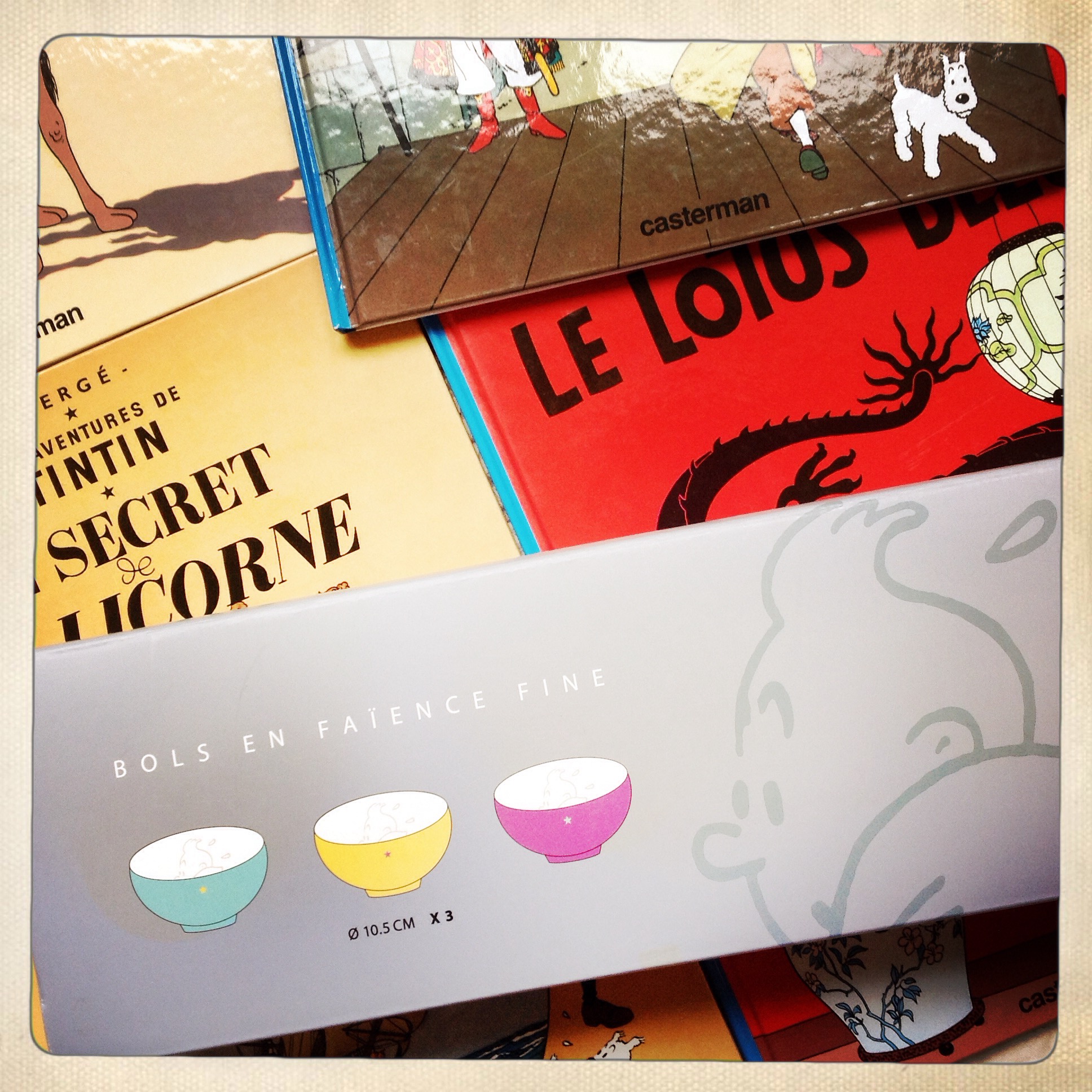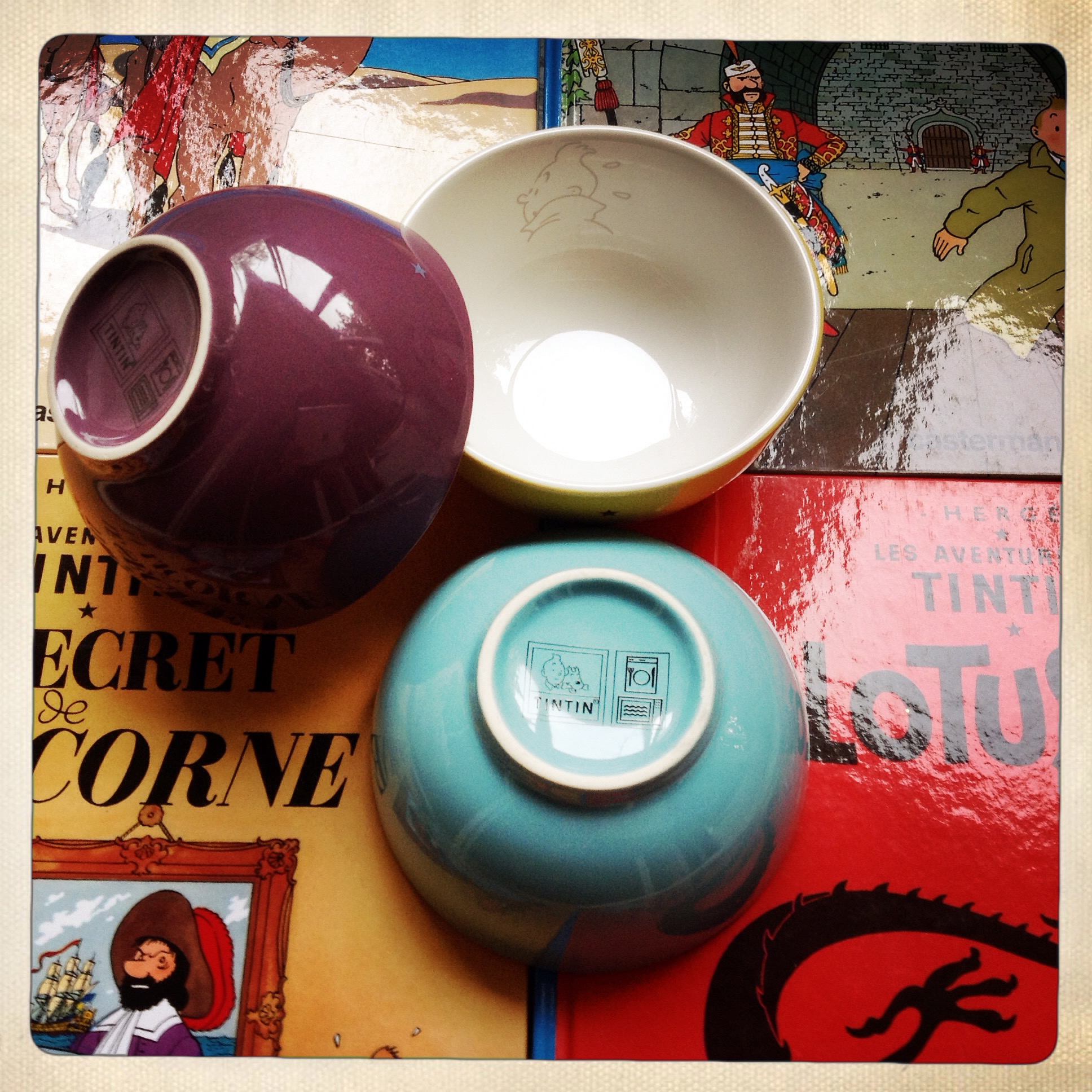 Les livres, c’est la base, mais quand on est tintinophile – ne perdez pas votre temps à farfouiller dans un dictionnaire à la recherche de ce mot – on est séduit par tous les objets dérivés: les tableaux, les statuettes et même la vaisselle! A la maison, j’ai une tasse, des pansements avec les jurons du capitaine Haddock et maintenant trois petits bols en faïence fine.
