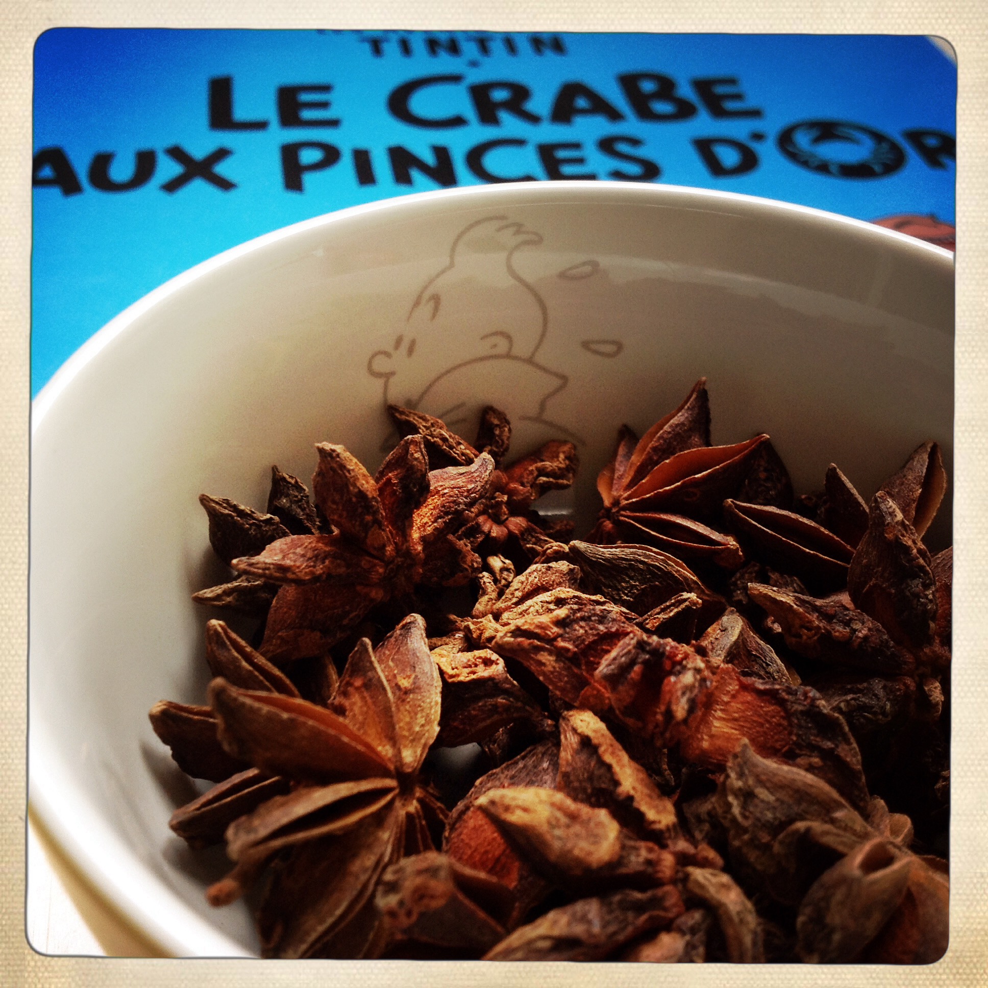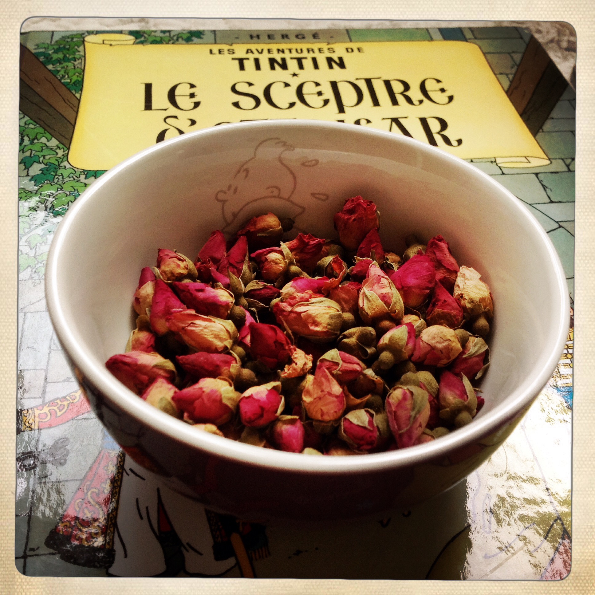 J’ai découvert ces bols en farfouillant à Carouge! Et je vous avoue que si je m’écoutais, je mettrais bien une fusée rouge et blanche, le vase du Lotus bleu et peut-être même le totem à l’oreille cassée sur ma bibliothèque! Mais…il parait que je suis grande! Alors je fais comme si c’était vrai et en attendant, je cache les personnages que j’aime dans ma vaisselle!