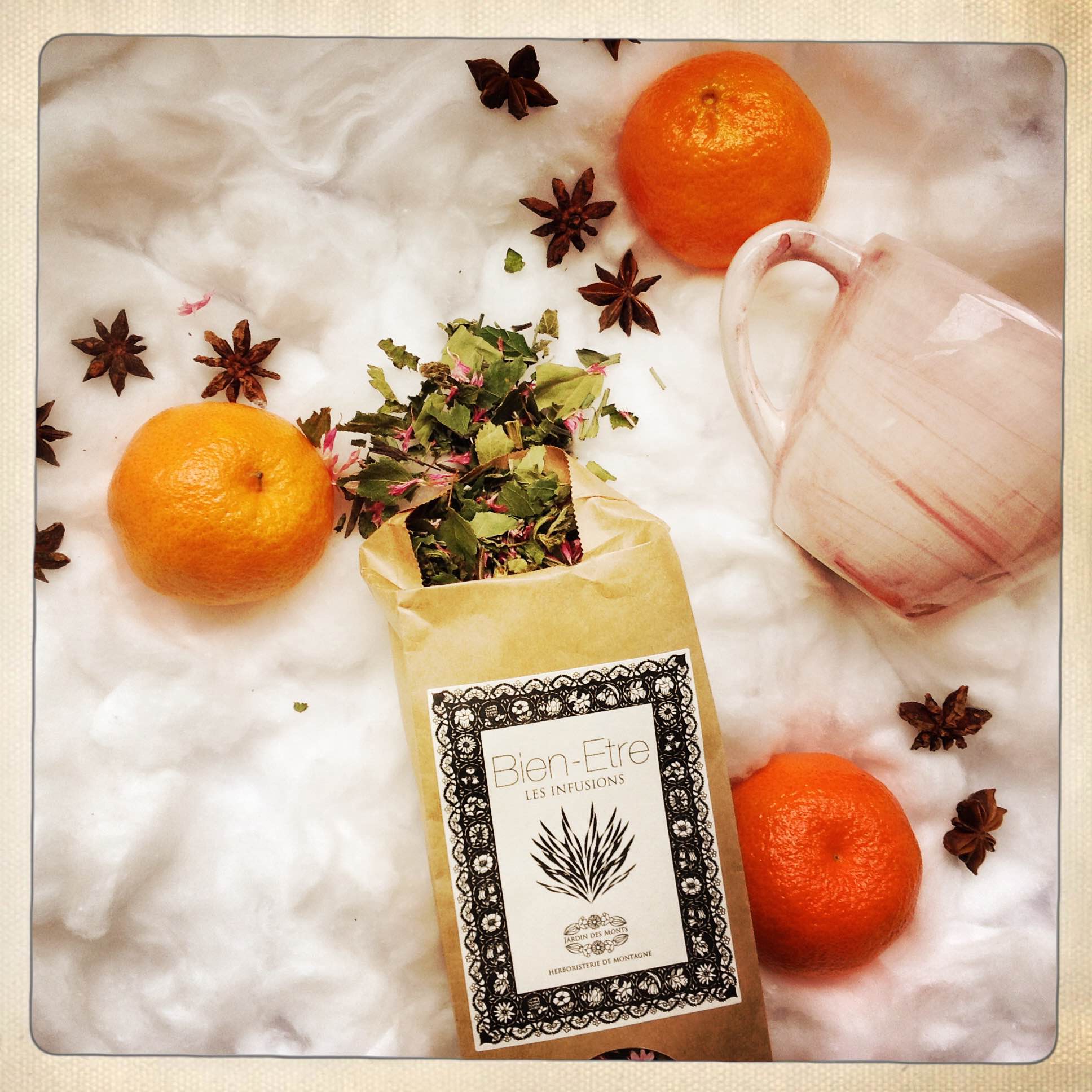 Est-ce que vous avez essayé d’aller en ville samedi après-midi? Mais pourquoiiiiiiiiiiiiiiiiiiii?? Mon Dieu, il y a des gens partouuuuuuuuuuuut! Ils se bousculent, ils sont agressifs et grossiers et tout cela pour faire des cadeaux de Noël! A croire qu’ils n’ont pas compris le concept de Noël! Bref… moi, j’ai fui le centre-ville pour me réfugier chez moi avec l’infusion « Bien-être » du Jardin des Monts.