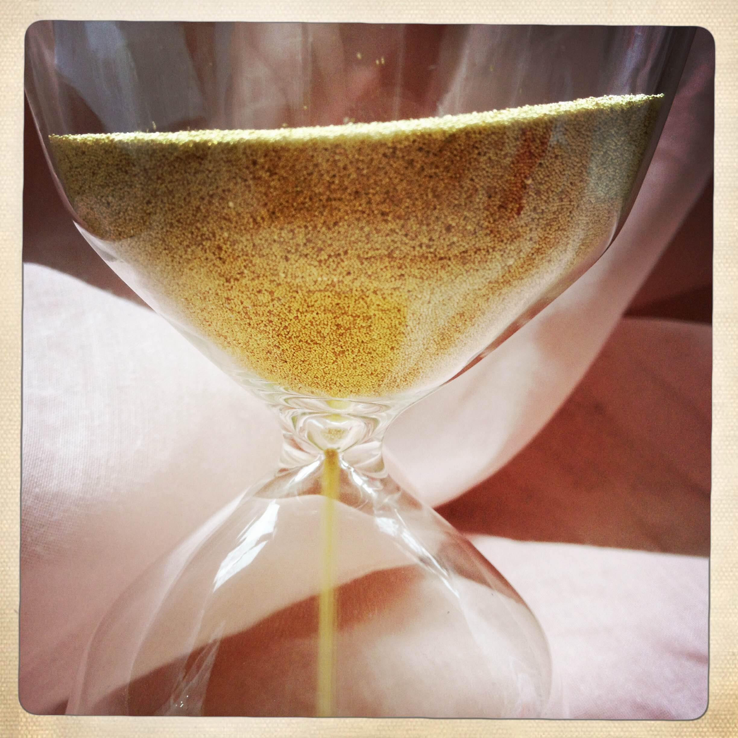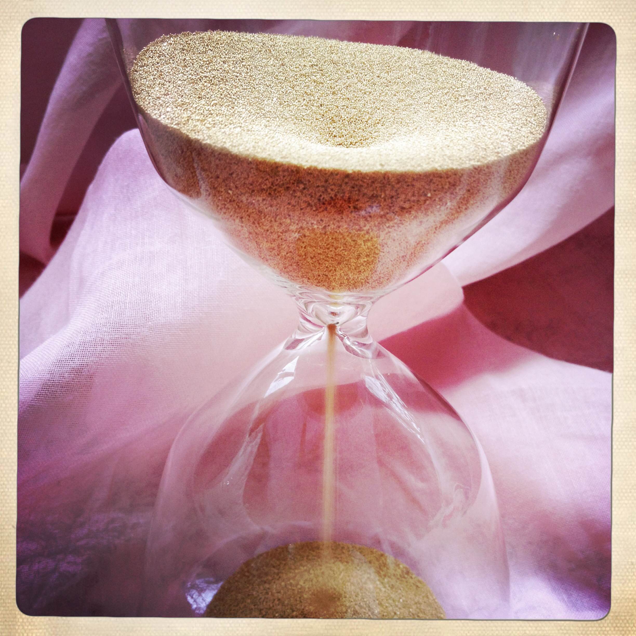 Et comment mieux visualiser le temps qui file qu’avec un sablier? Chaque grain représente une particule de temps qui glisse sans qu’on puisse la retenir ou la prolonger! Une seconde qui représente le futur au sommet du sablier, puis en l’espace d’une seconde s’écrase dans le passé!