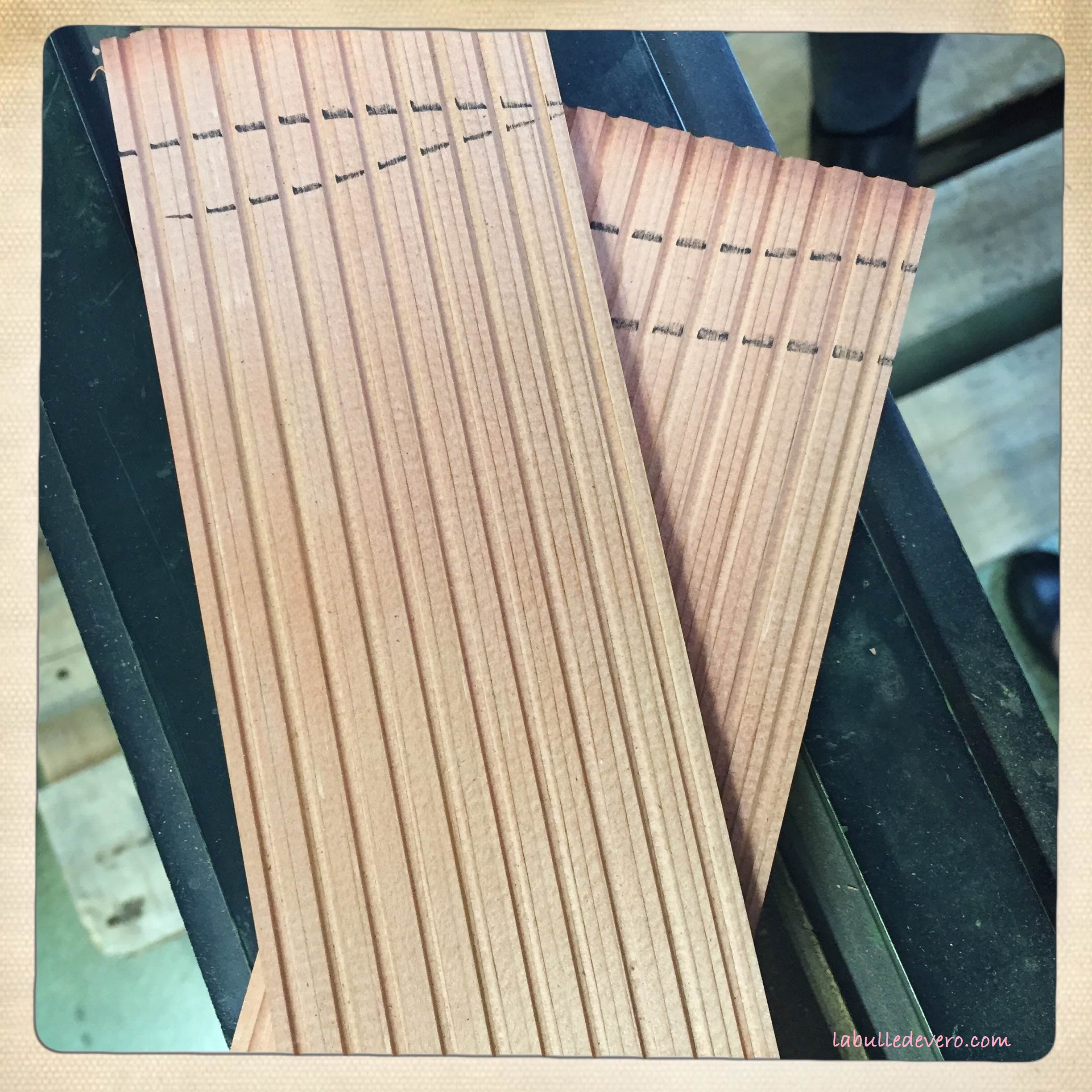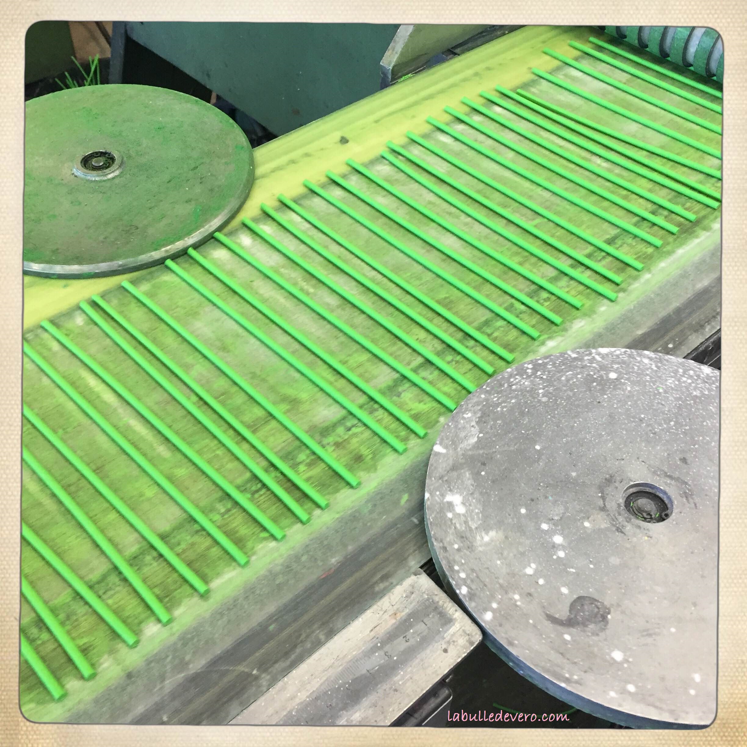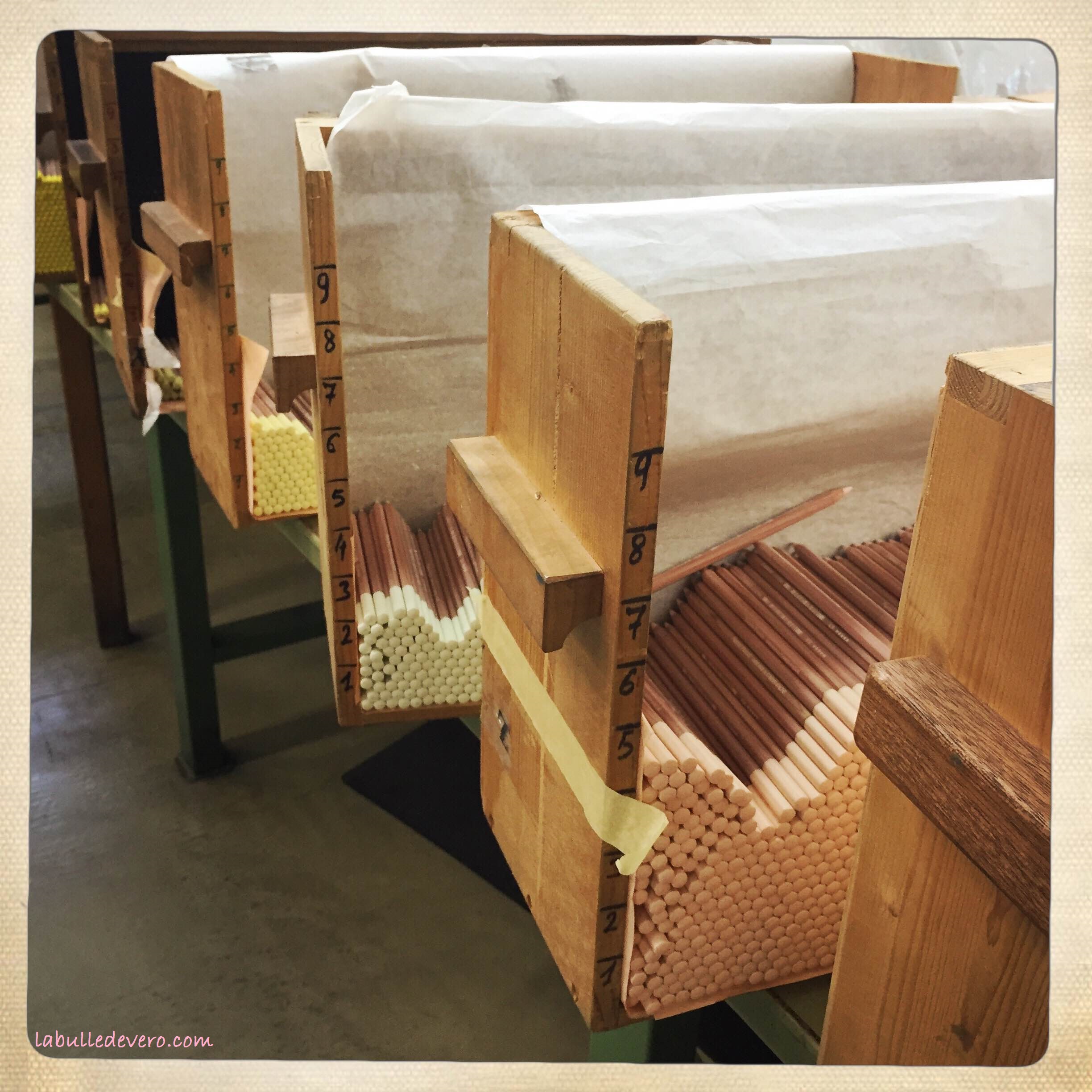 L’une des étapes suivantes est l’habillage du crayon. L’enveloppe du crayon telle qu’on la connaît provient d’une petite plaquette en bois.
