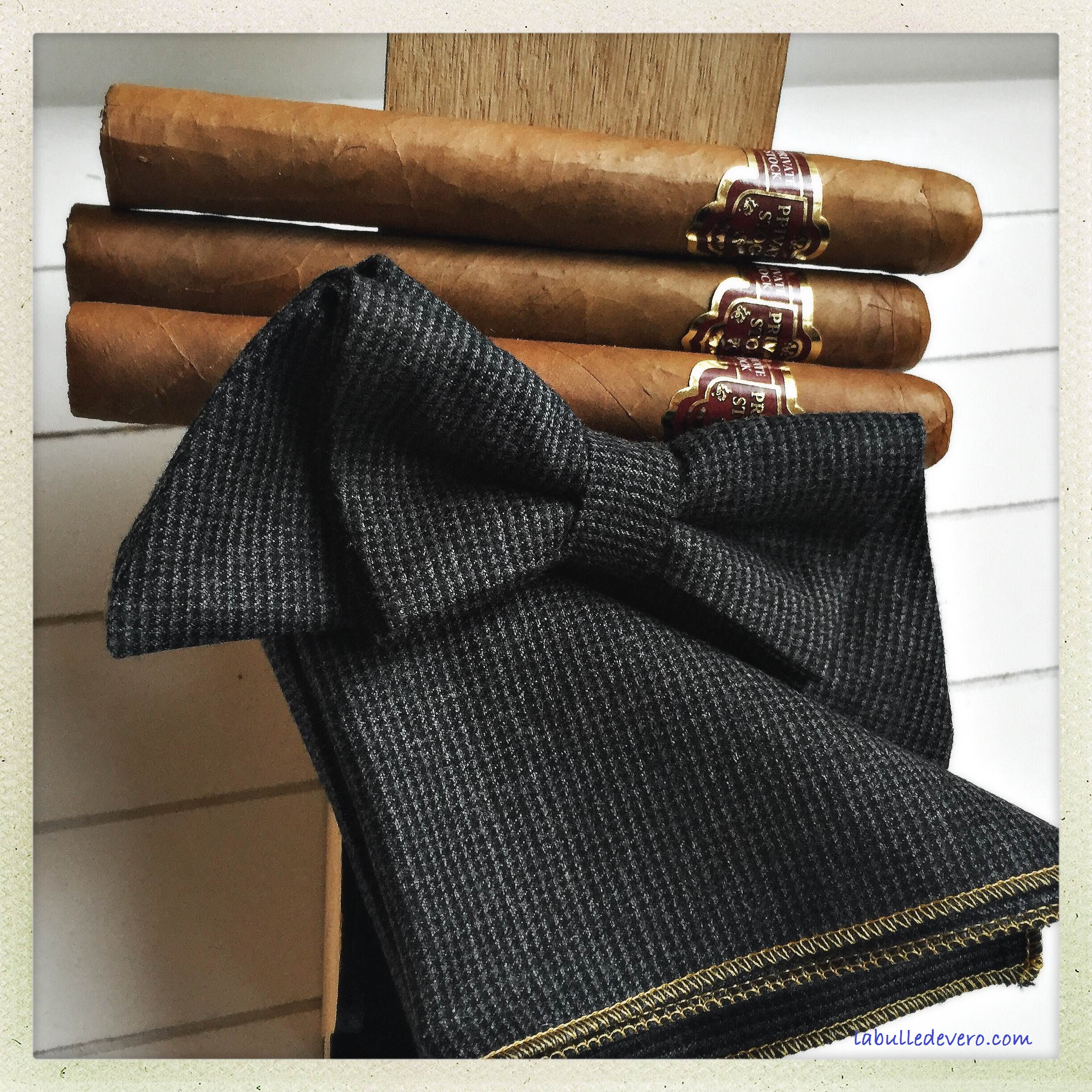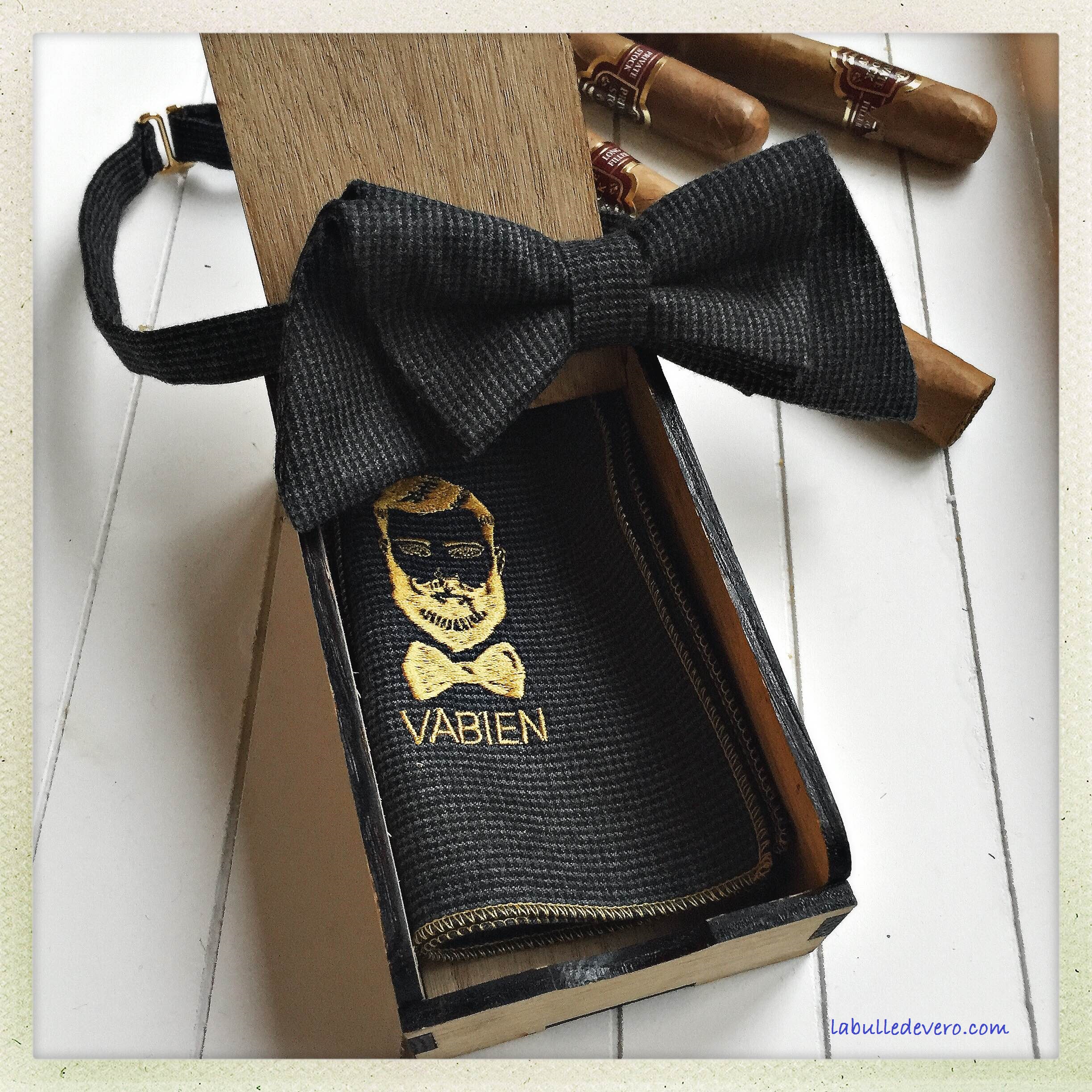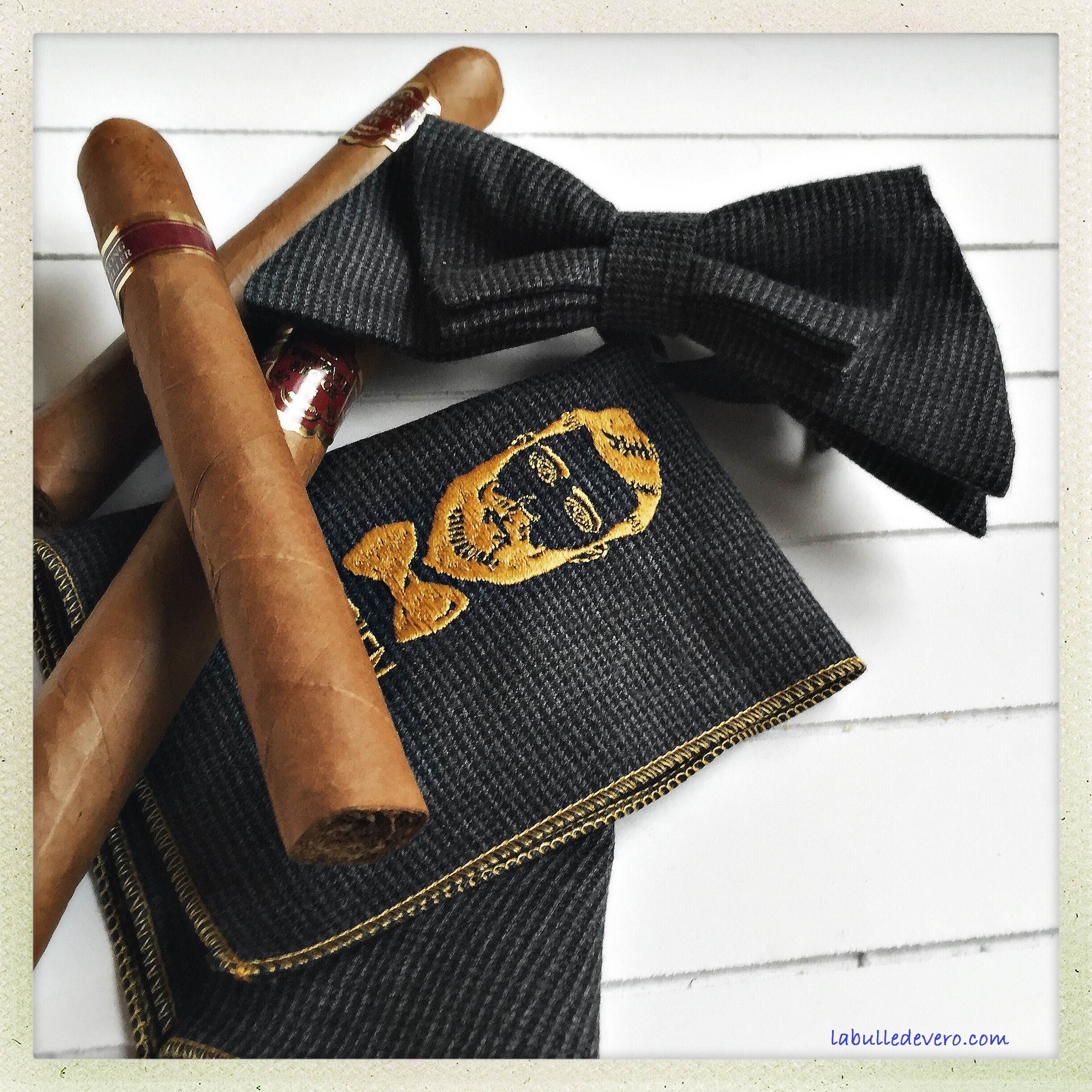 Je vous parle donc de cette marque toute jeune que j’ai découverte chez Globus. Dans une jolie boite en bois, on découvre soit un nœud papillon, soit le même nœud accompagné de sa pochette.