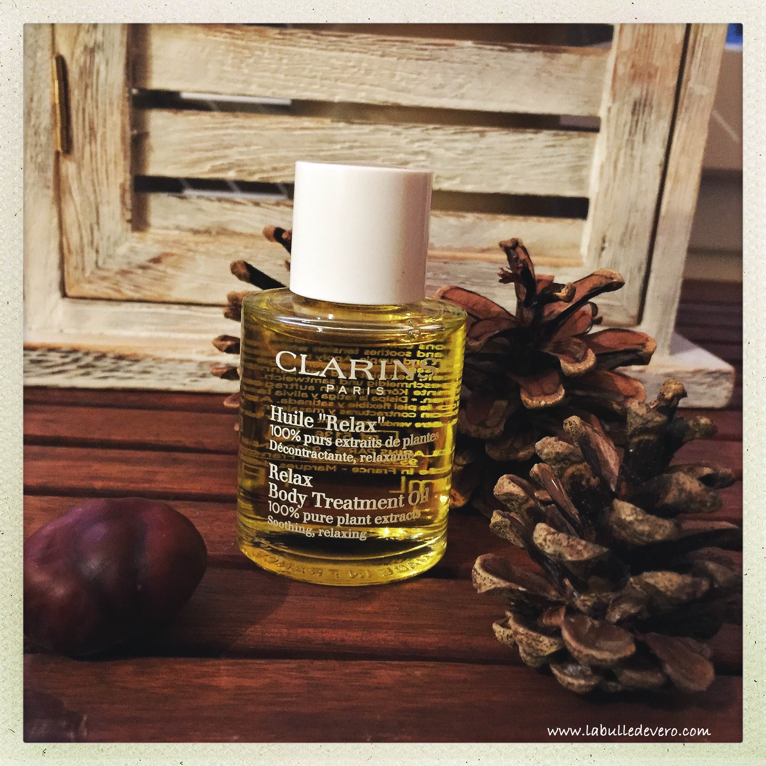 Pour le confort du corps, il y a un petit flacon d’huile relax. Les huiles de Clarins, ce sont les produits que je préfère. Je dois avouer avoir une préférence pour la tonic, mais la relax n’est pas mal du tout. A appliquer soi-même ou avec un peu d’aide pour un super massage.