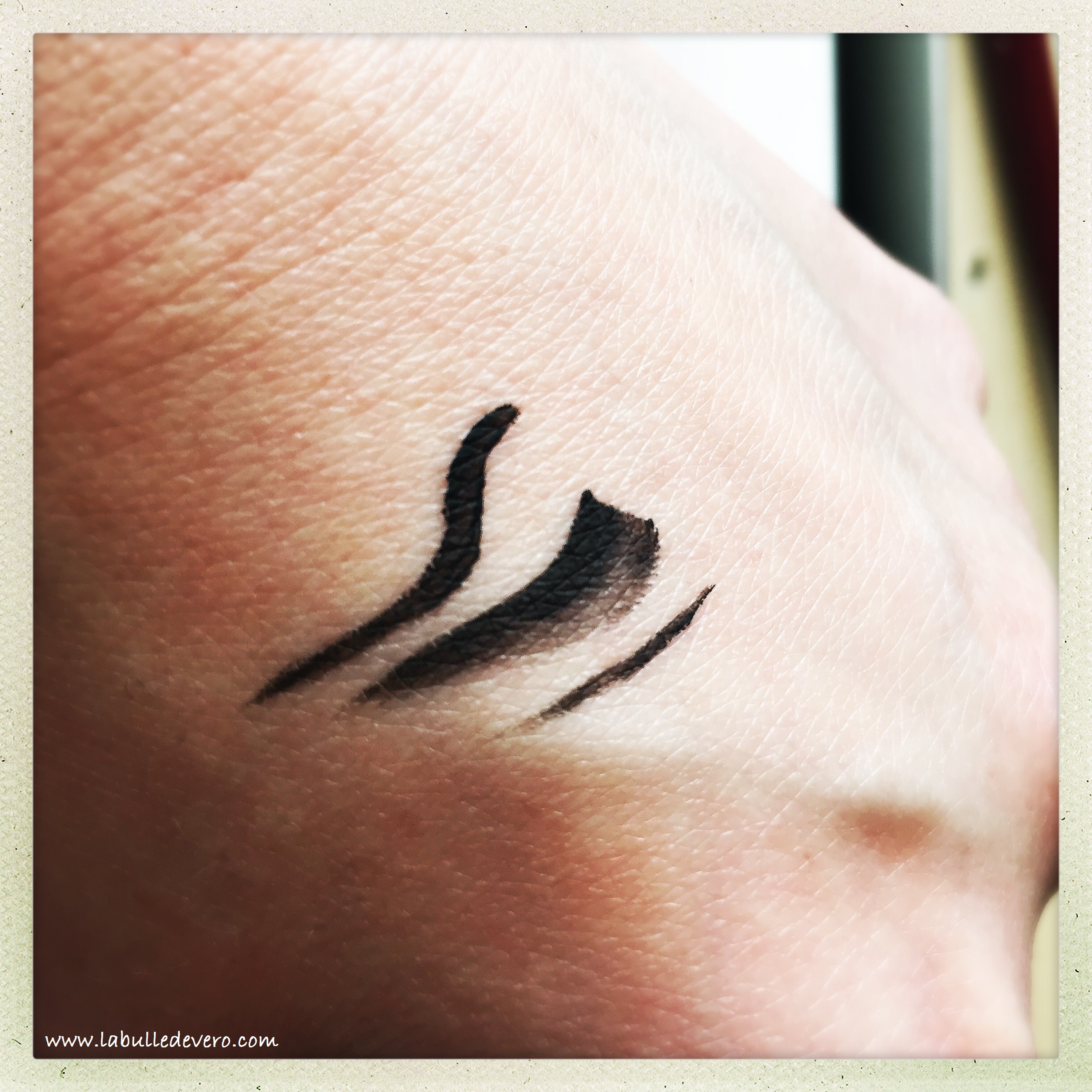 J’ai, bien sûr, fait le test et comme vous pouvez le voir, il est facile de réaliser différentes épaisseurs de traits en fonction de l’inclinaison du pinceau. Il tient vraiment bien et résiste à l’humidité! Parfait pour les jours d’hiver!
