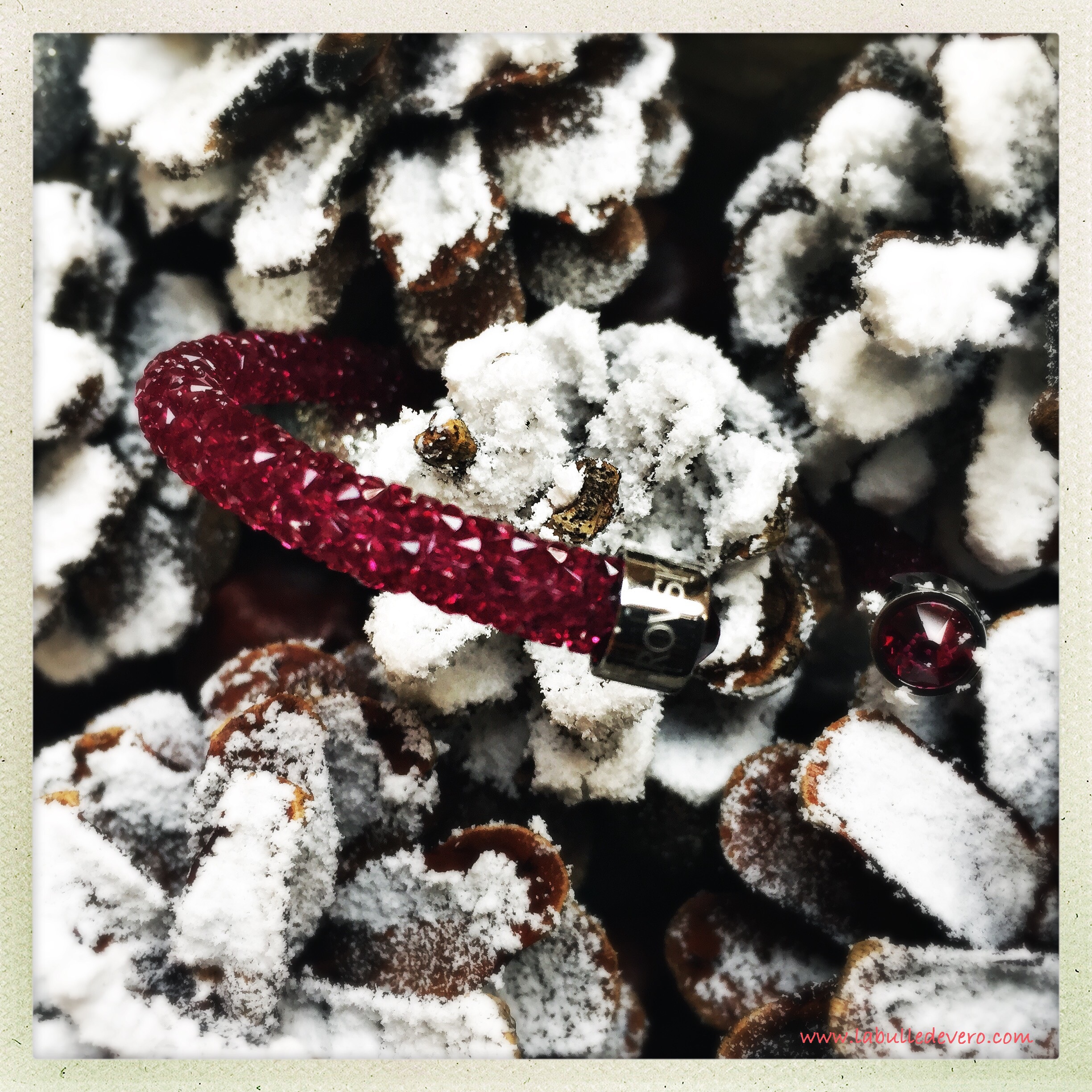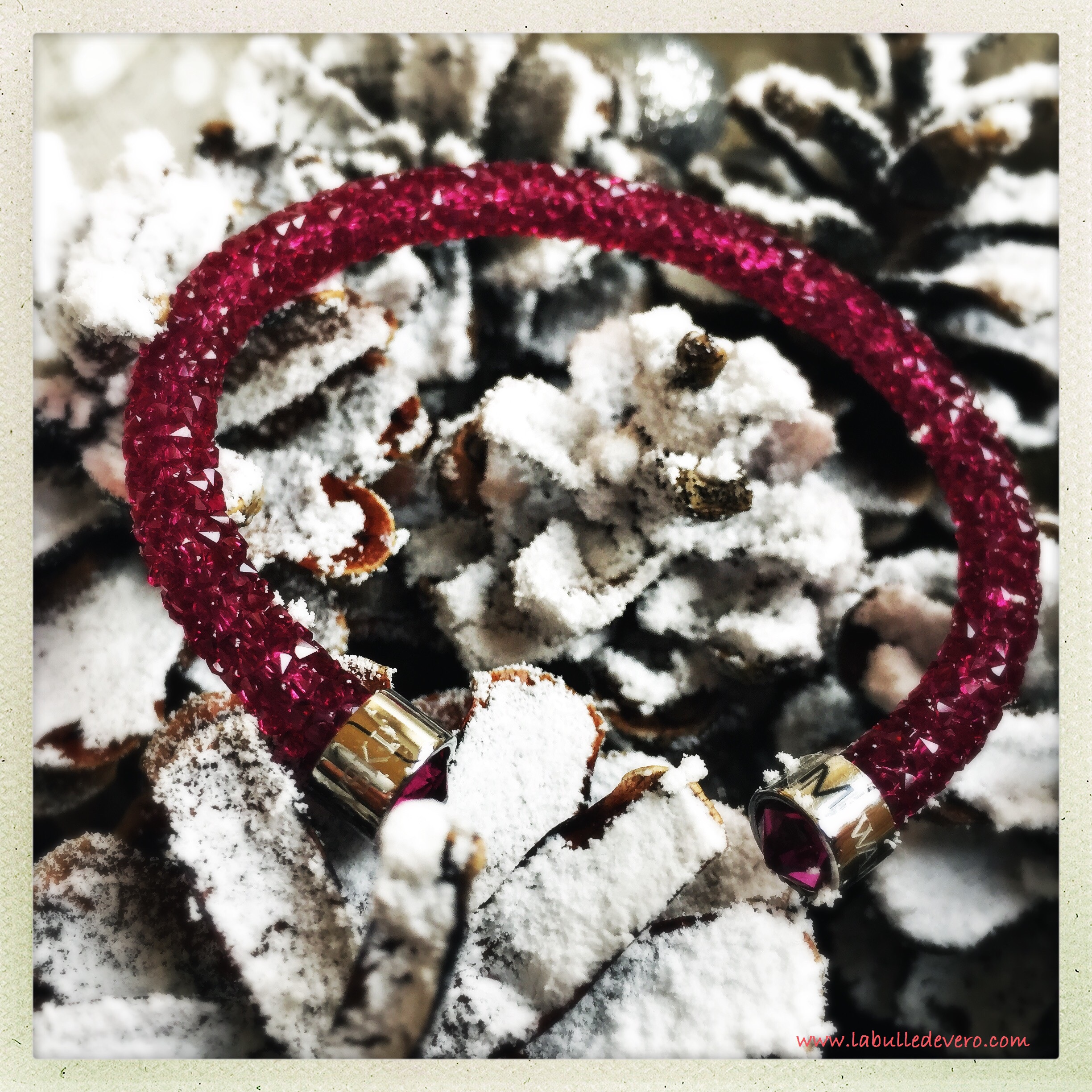 On dirait que ce bracelet a givré avec le froid qui arrive! Il a, en réalité, été façonné selon la technique Crystal Rock de Swarovski et est incrusté de cristaux rouge vif.
