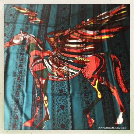 Comme vous pouvez le voir, j’ai choisi un carré couleur pétrole avec le motif de Pégase. Il s’agit d’un cheval ailé divin. L’une des créatures les plus célèbres de la mythologie grecque. Il a pour père Poséidon et il naît avec son frère Chrysaor du sang de la gorgone Méduse, lorsqu’elle est décapitée par Persée. Après sa naissance, il s’envole vers l’Olympe pour se mettre au service de Zeus.