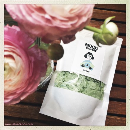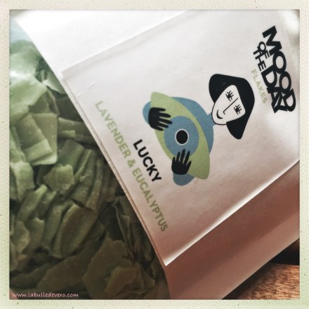 Il existe 7 humeurs du jours: « Curious » qui est jaune et qui sent le romarin et la sauge, « Happy », orange, qui fleure le citron et le bois de rose, « Loved » tout rose qui sent le jasmin et la bergamote, « Sexy », bien évidemment rouge, dont la fragrance révèle l’ylang ylang et les baies, « Calm » violet et qui sent le jasmin et la camomille, le bleu « Relaxed » à la lavande et à la camomille et enfin celui que j’ai choisi: « Lucky », tout vert, et qui sent la lavande et l’eucalyptus. Je me suis dit que ce serait parfait pour cette période frisquette où j’ai pris un peu froid.