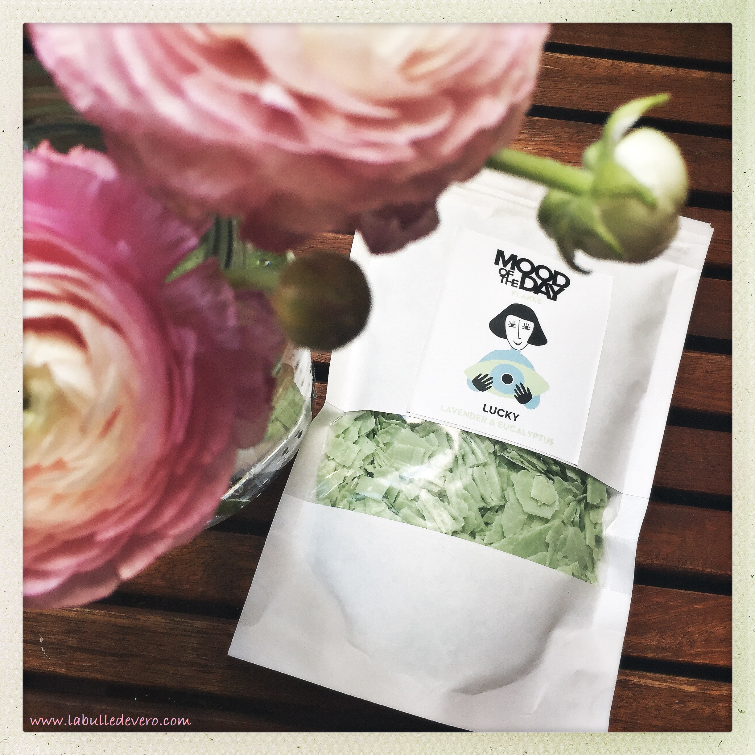 Mais quel temps, les amis! La journée a commencé avec un paysage tout blanc et voilà qu’il est devenu tout gris avec un rideau de pluie continu. Quelle tristesse! Du coup… je n’ai pas envie de mettre le plus petit orteil à l’extérieur! C’est l’occasion de tester les flocons pour le bain que j’ai acheté chez Globus, les flocons Mood of the Day!