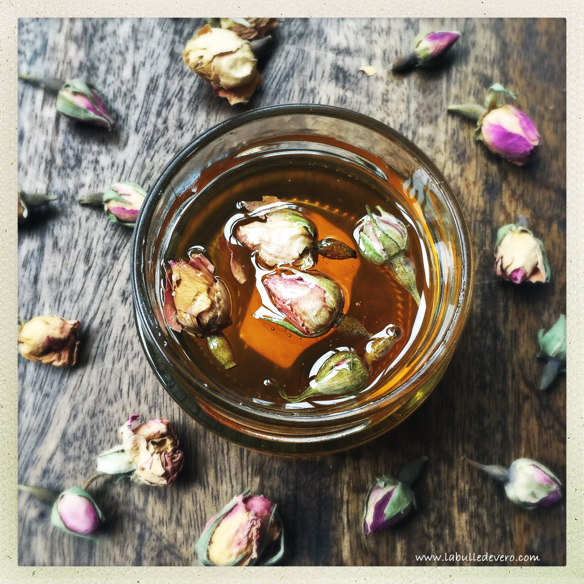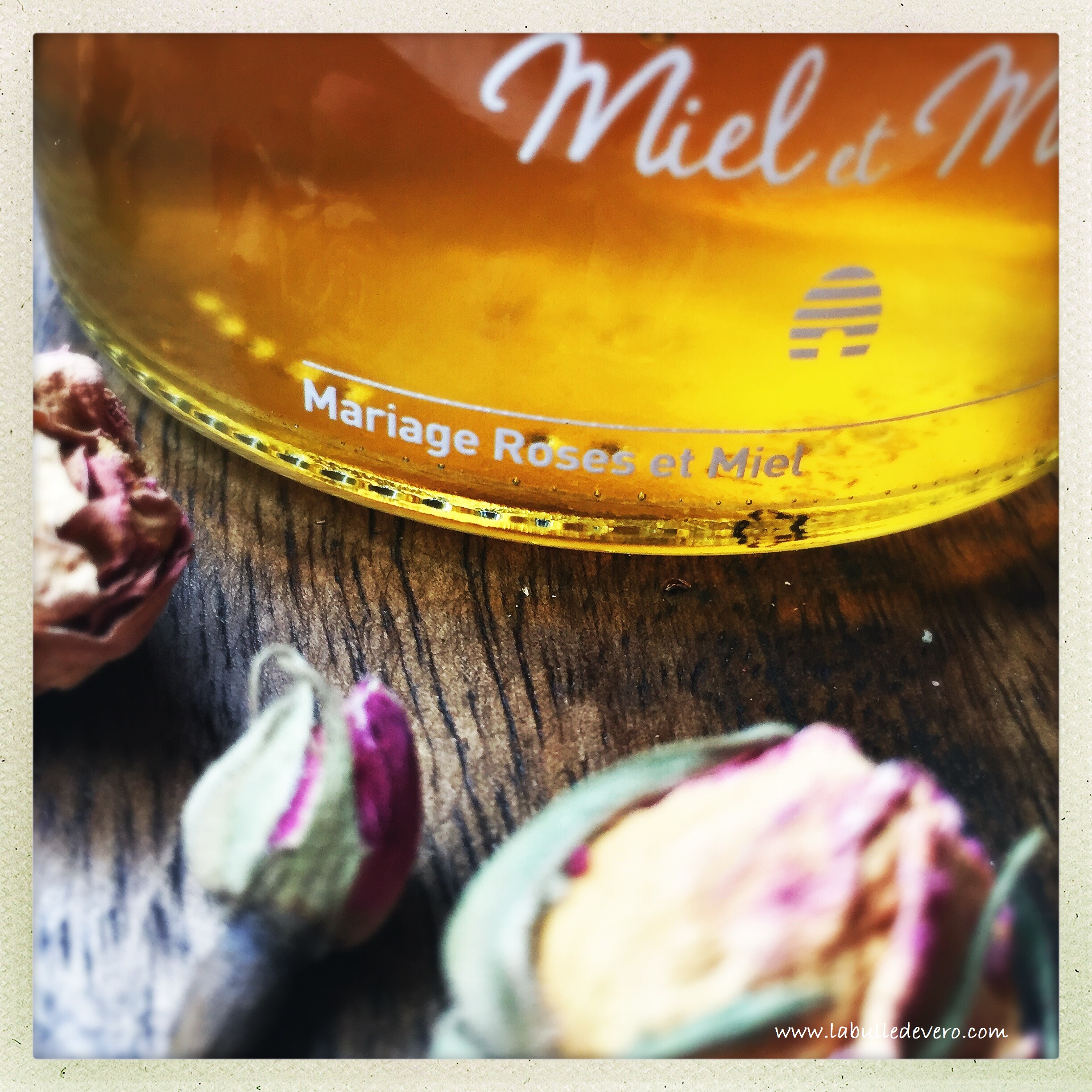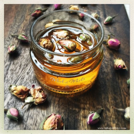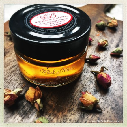Ce miel est bon, mais il est encore plus beau que bon, car quelques roses sont emprisonnées dans le miel. C’est un vrai plaisir gustatif et visuel! C’est un miel digne d’un conte de fée pour un petit déjeuner de princesse! J’adore!