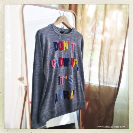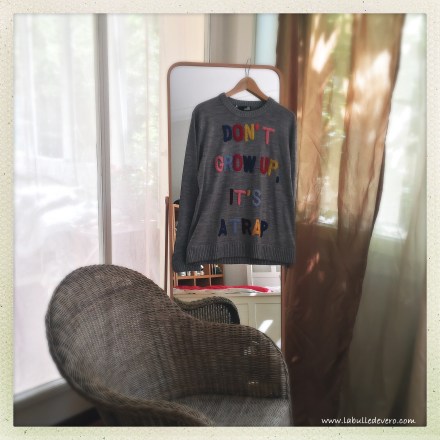 Enfin en vacances et cela fait du bien. Ces dernières semaines ont été un peu difficiles autant au niveau professionnel que personnel. J’ai beaucoup appris et malheureusement j’ai appris que ce ne sont souvent pas les plus méritants qui gagnent ou qui obtiennent de l’attention. Ce ne sont pas les plus méritants qui récoltent les fruits de leurs labeurs, mais ceux qui font le plus de bruit et ceux qui parviennent à concentrer l’attention sur eux. Je devrais déjà avoir intégrée ces éléments de vie mais je vis dans un monde de bisounours, donc c’est une très grosse baffe pour moi. Je trouve cela très usant. Je ne dirai donc que « Don’t Grow Up, It’s a Trap ». J’ai acheté ce pull, il y a quelques semaines, mais je crois que je n’ai jamais autant ressenti la véracité de ces propos qu’aujourd’hui.