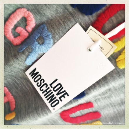 Ce joli pull a été réalisé par Love Moschino. Je ne pense pas que ce soit la dernière collection, car j’ai dû farfouiller un peu pour le trouver sur Internet. Il existe en deux couleurs: en bleu marine et en gris. Je le trouvais plus doux en gris. Il est réalisé en laine vierge puis brodé avec du coton très fin et tout doux. . Il est très fin et est donc parfait pour la saison et ses soirées parfois un peu fraiches!