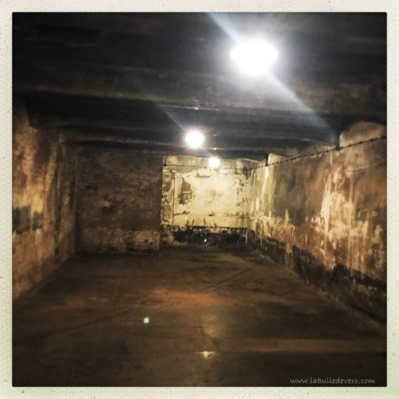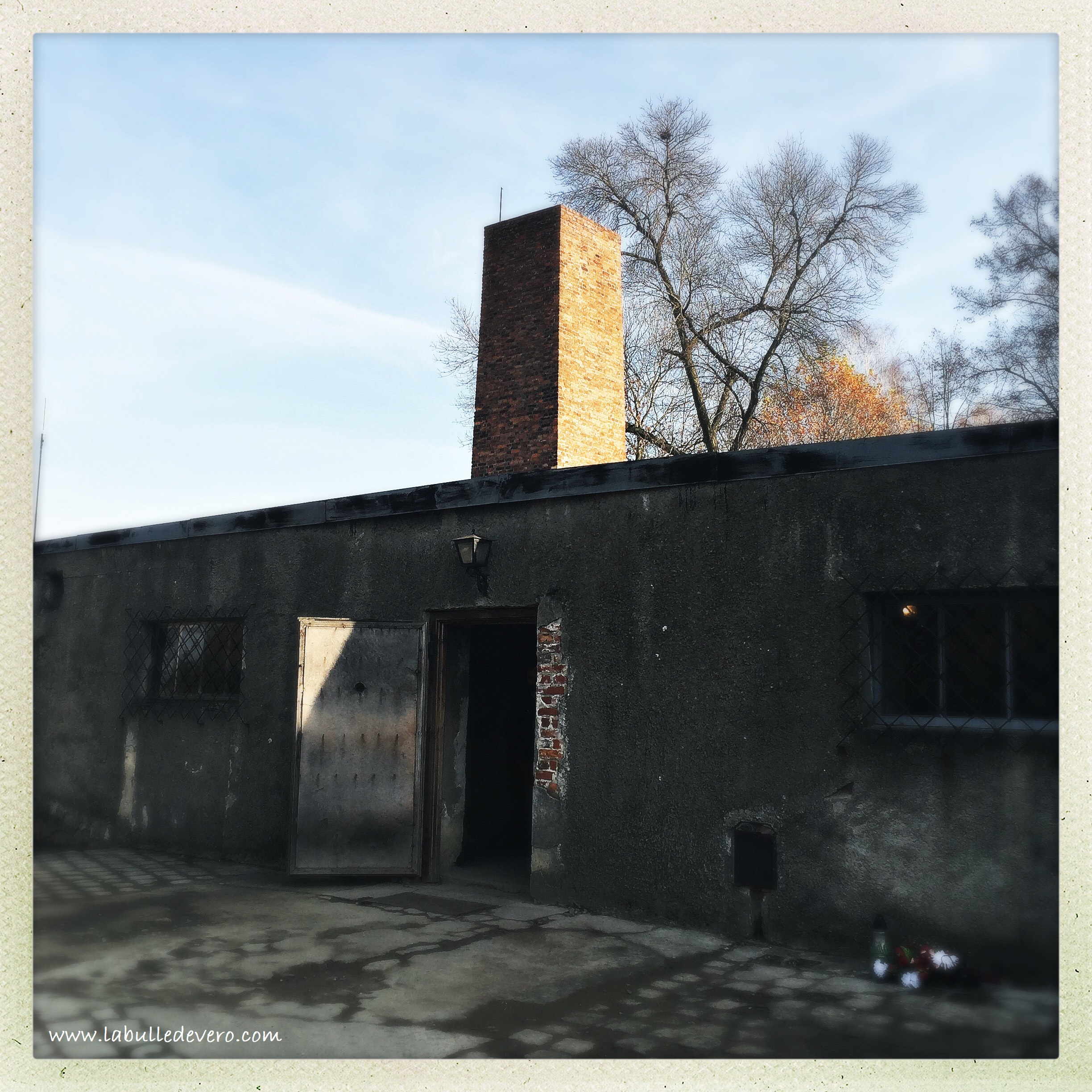 Nous voici donc arrivés dans la première chambre à gaz du camp qui était avant le début de la guerre un entrepôt, puis fut transformé en chambre à gaz de 1941 à 1944 en attendant que celles de Birkenau soient fonctionnelles. Au moyen du Zyklon B, les nazis ont gazés jusqu’à 340 personnes par jour. En 1944, les Nazis démontèrent les fours et la cheminée. Ils colmatèrent les ouvertures par lesquelles le Zyklon-B était dispersé.