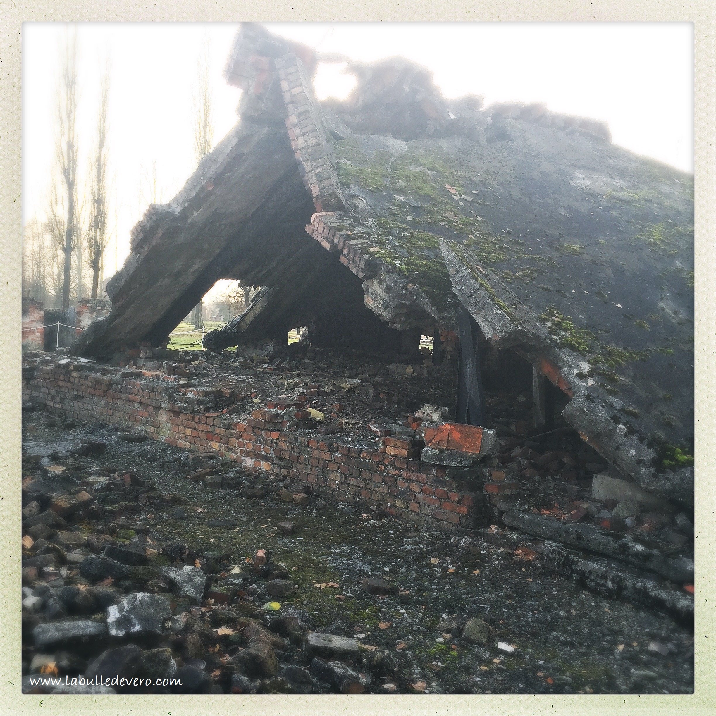 Lorsqu’on arrive au bout des rails, on entre dans Birkenau et on découvre les restes des chambres à gaz qui ont été détruites à la va vite.