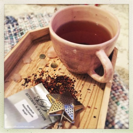 Oh la la! Quelle belle journée! J’en ai profité à fond, mais s’il fait incroyablement beau, il ne fait pas encore bien chaud! Un petit thé était donc nécessaire en rentrant à la maison. Ce soir, j’ai choisi le Honeybush, aux saveurs de pistache, amande et nougat de Betjeman & Barton.