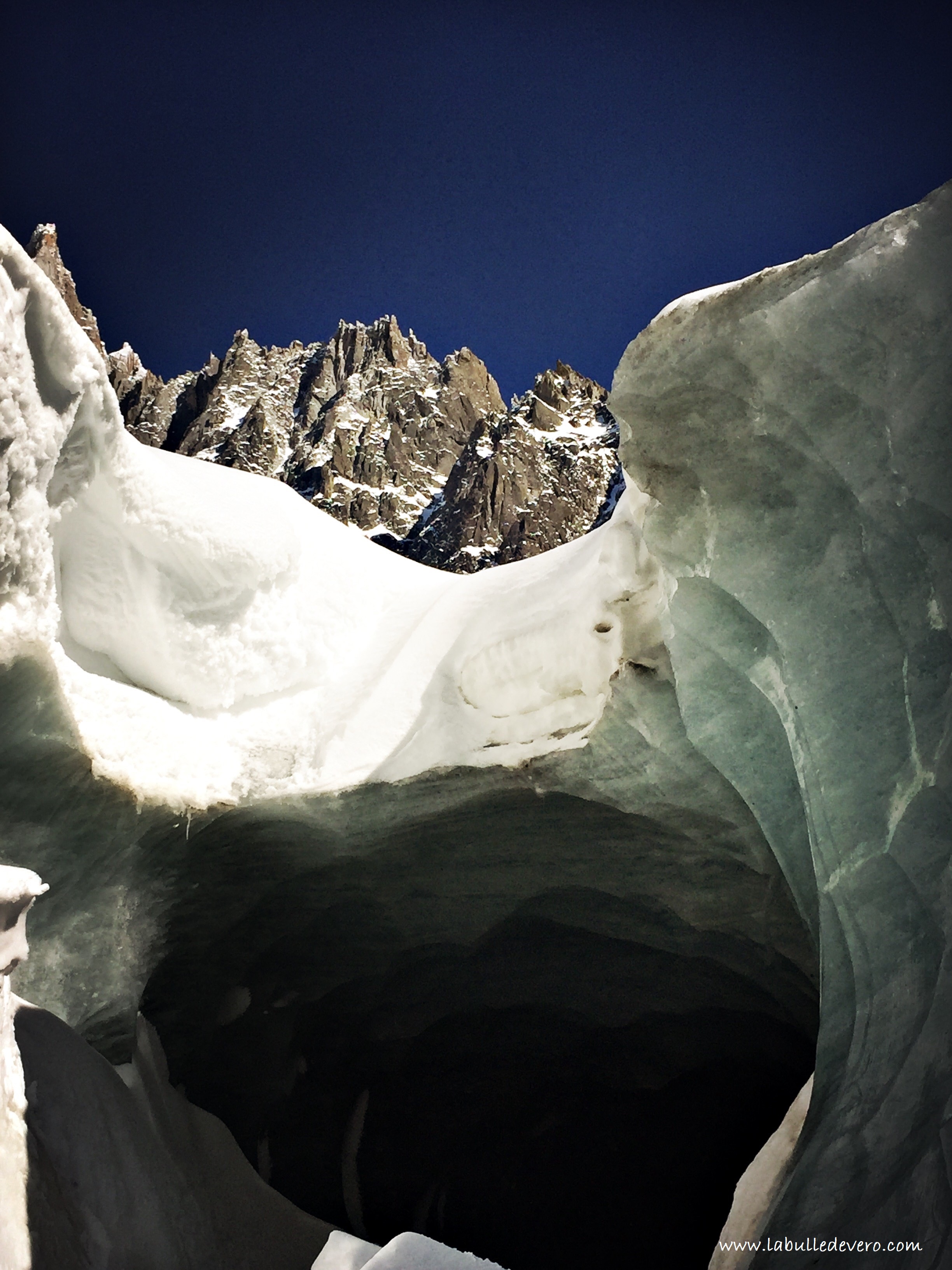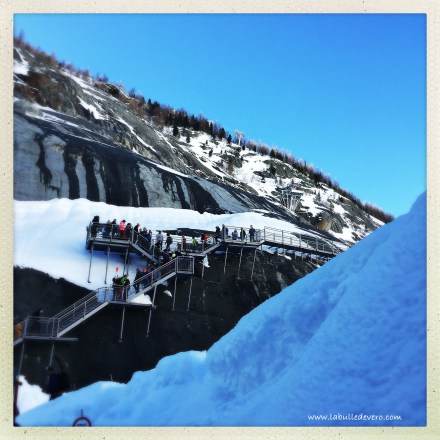 550 marches aussi pour observer le paysage (ce qui explique la chute!). Selon Wikipedia, la Mer de Glace est un glacier de vallée alpin qui est formé par la confluence du glacier du Tacul et du glacier de Leschaux et qui s’épanche dans la vallée de l’Arve. Le glacier s’étend sur 7 km de long et son épaisseur oscille entre 200m et 400m. Cela semble beaucoup, pourtant, tout au long du des escaliers accrochés au rocher, on voit où se trouvait le glacier dans le passé et sa hauteur baisse inexorablement. Il a en effet perdu 120 mètres sur sa partie minimale depuis 1860. Il n’y a pas meilleur moyen de se rendre compte du réchauffement climatique que d’y être confronté directement avec des faits très concrets!