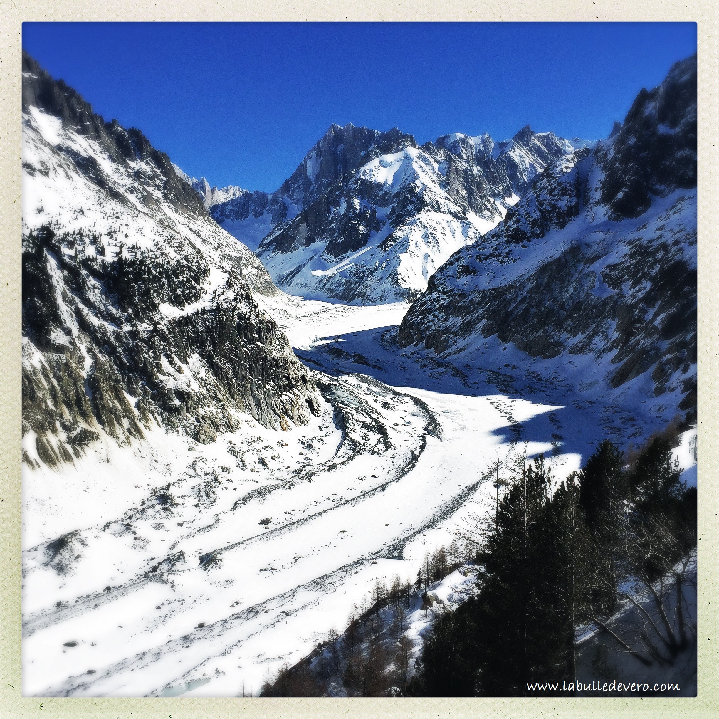 Lorsque j’étais étudiante, j’ai étudié « Le Voyage de Monsieur Perrichon » de Eugène Labiche et Edouard Martin (1860). Si vous ne connaissez pas ce livre , il raconte l’histoire de M. Perrichon, un bon bourgeois qui est à lui tout seul un cliché ambulant, qui part pour la première fois en vacances en train pour découvrir la Mer de Glace de Chamonix. Imbu de lui-même, il se laisse gentiment manipuler par deux jeunes hommes qui cherchent à le flatter pour mieux séduire sa fille. Mais ce qui nous intéresse donc, c’est la Mer de Glace, car pour mon anniversaire, j’ai pu me plonger dans l’univers de Monsieur Perrichon, ou presque car depuis 1860, le glacier a bien fondu!