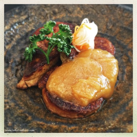 Retour de weekend prolongé oblige, avec la journaliste avec qui je déjeunais, nous avons décidé de prendre deux entrées. Nous avons débuté avec LE plat qui me tentait depuis des lustres: le foie gras poêlé à la sauce sumiso. Un vrai bonheur. J’adore le foie gras poêlé, avec cette sauce aigre-douce… une vraie révélation. Je retournerai dans ce restaurant rien que pour ce plat.