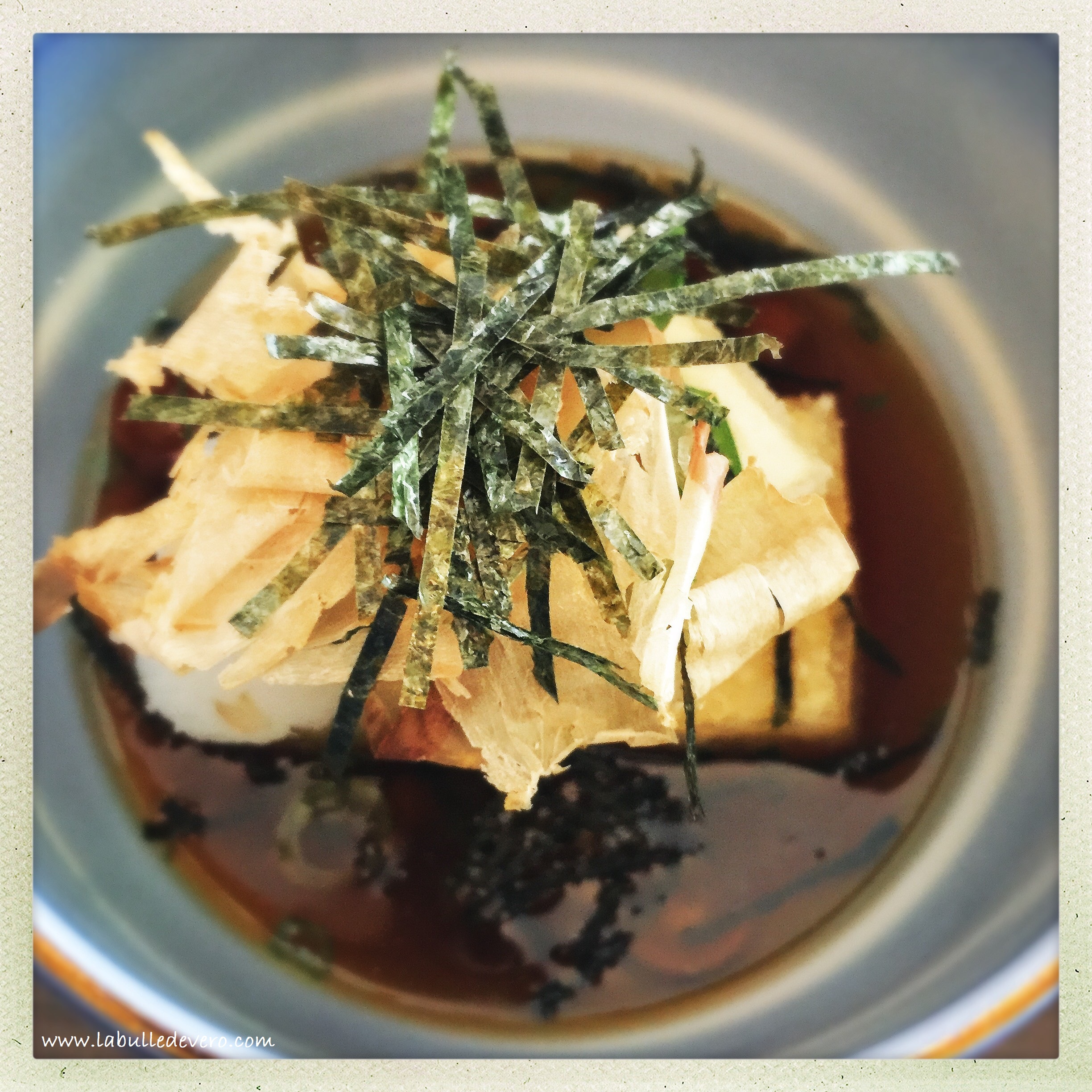 Pour être un peu plus sage, j’ai poursuivi avec un beignet de tofu, ou plus précisément Agedashi Dofu. Le tofu est très crémeux avec une petite croûte croustillante. Il est accompagné d’un excellent bouillon qui donne tout le goût. Je ne suis pas une grande adepte du tofu, mais j’aime bien découvrir de nouvelles choses en sachant que je suis au bon endroit pour le faire.