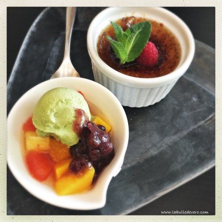 Mon amie a choisi le thon rouge aux poireaux à la sauce sumiso. Elle s’est aussi régalée. Personnellement, je n’aime pas le thon crû, donc je suis incapable de vous donner un avis à ce sujet. Elle a terminé son repas avec une crème brûlée aux marrons. Pas très oriental, me direz-vous, et vous aurez bien raison!