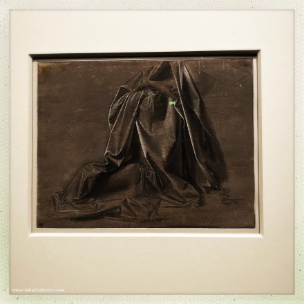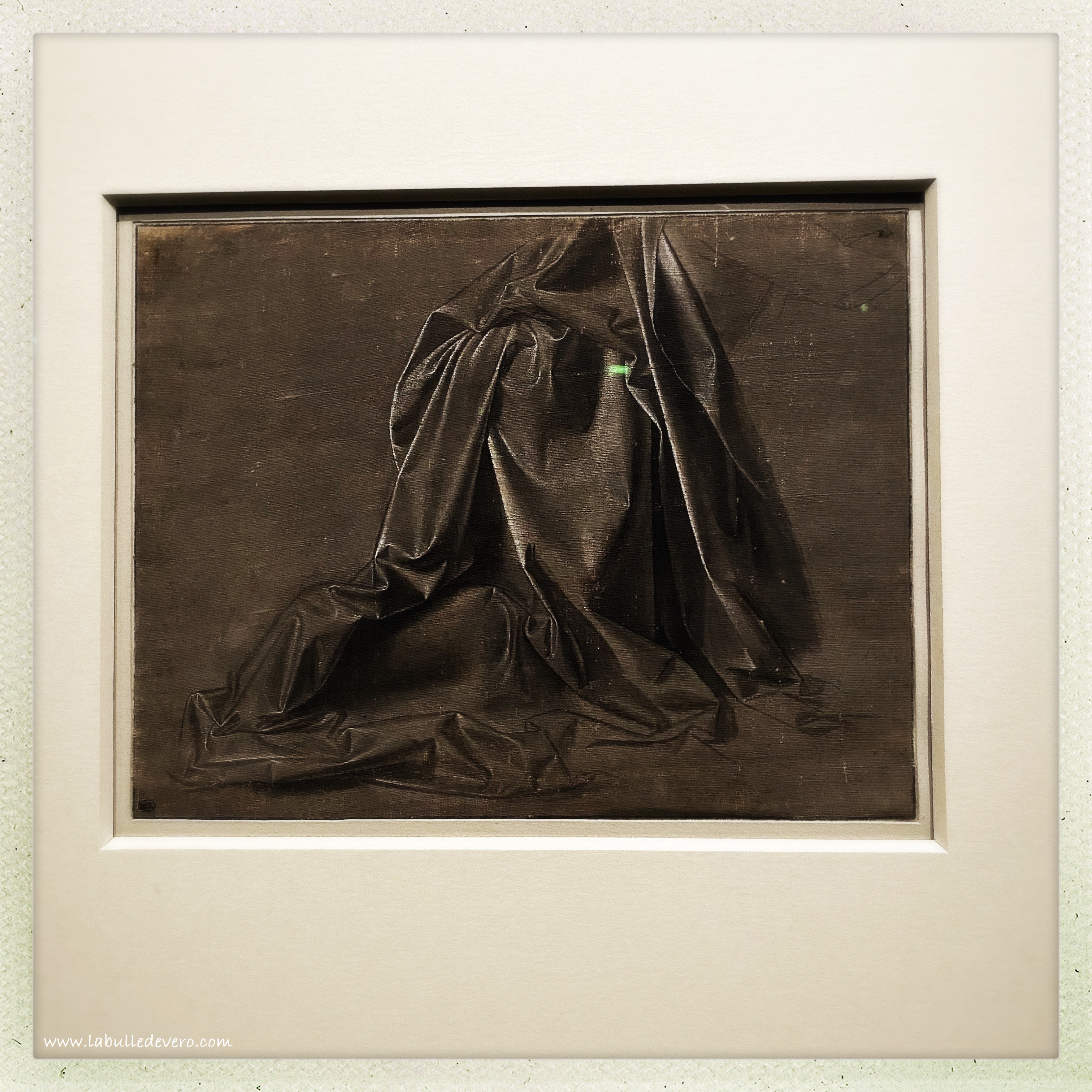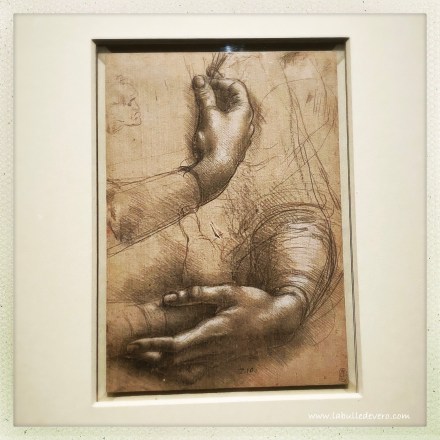 L’exposition commence débute avec cette sculpture: Le Christ et Saint Thomas (1467-1483). Cette première œuvre nous permet d’entrer dans la carrière de Léonard qui a fait ses premiers pas dans les ateliers Andrea Del Verrocchio qui était l’un des plus grands sculpteurs du quinzième siècle. Tout autour de cette œuvre, on voit des esquisses et des études du mouvement du tissu (comme ci-dessus), ainsi que du clair obscur. On comprend donc le travail en amont pour parvenir à cette réalisation.