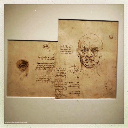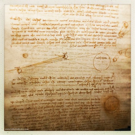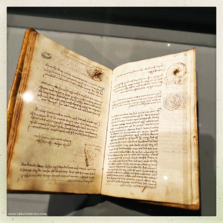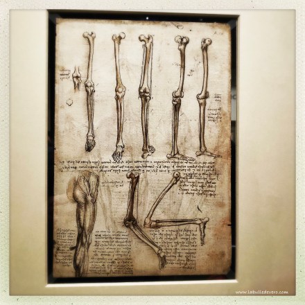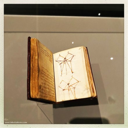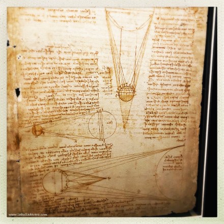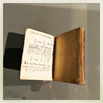La salle suivante a été ma préférée! C’est celle où l’on retrouve les cahiers de Léonard de Vinci. Celui-ci en avait toujours un sur lui et il y notait tout avec sa fameuse écriture inversée pour laquelle il faut un miroir pour pouvoir décryptée les textes!