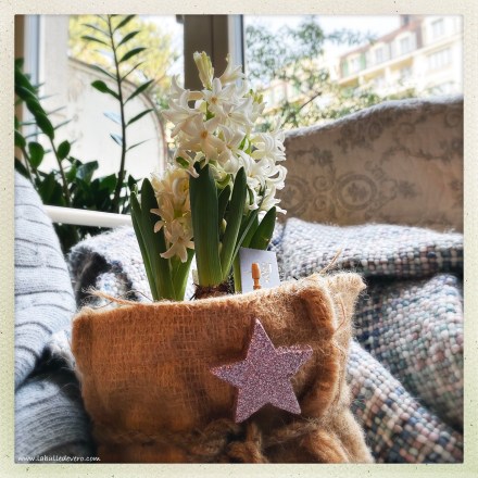 Dimanche 22 décembre: le solstice d’hiver est enfin passé et cela veut dire que les jours recommencent à croitre et cela veut aussi dire que le printemps est sur le chemin du retour. Je sais bien que la majorité d’entre vous entre dans leurs vacances d’hiver et se réjouissent de la neige et du ski. Moi aussi: ne vous en faites ! Je me réjouis de ces 15 prochains jours, mais je me réjouis encore plus du retour de la lumière! Je suis en carence sévère et j’ai l’impression que cela pèse sur le moral des gens autour de moi. Je n’entends que des gens ronchonner et cela me fatigue! Il nous faut de la vitamine D et vite! Pour garder le moral au beau fixe et pour mon leurrer un peu mon cerveau, je me suis achetée ces jolies jacinthes de Noël chez Wuillemin Fleurs il y a une dizaine de jours!