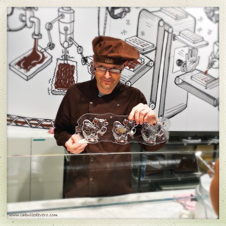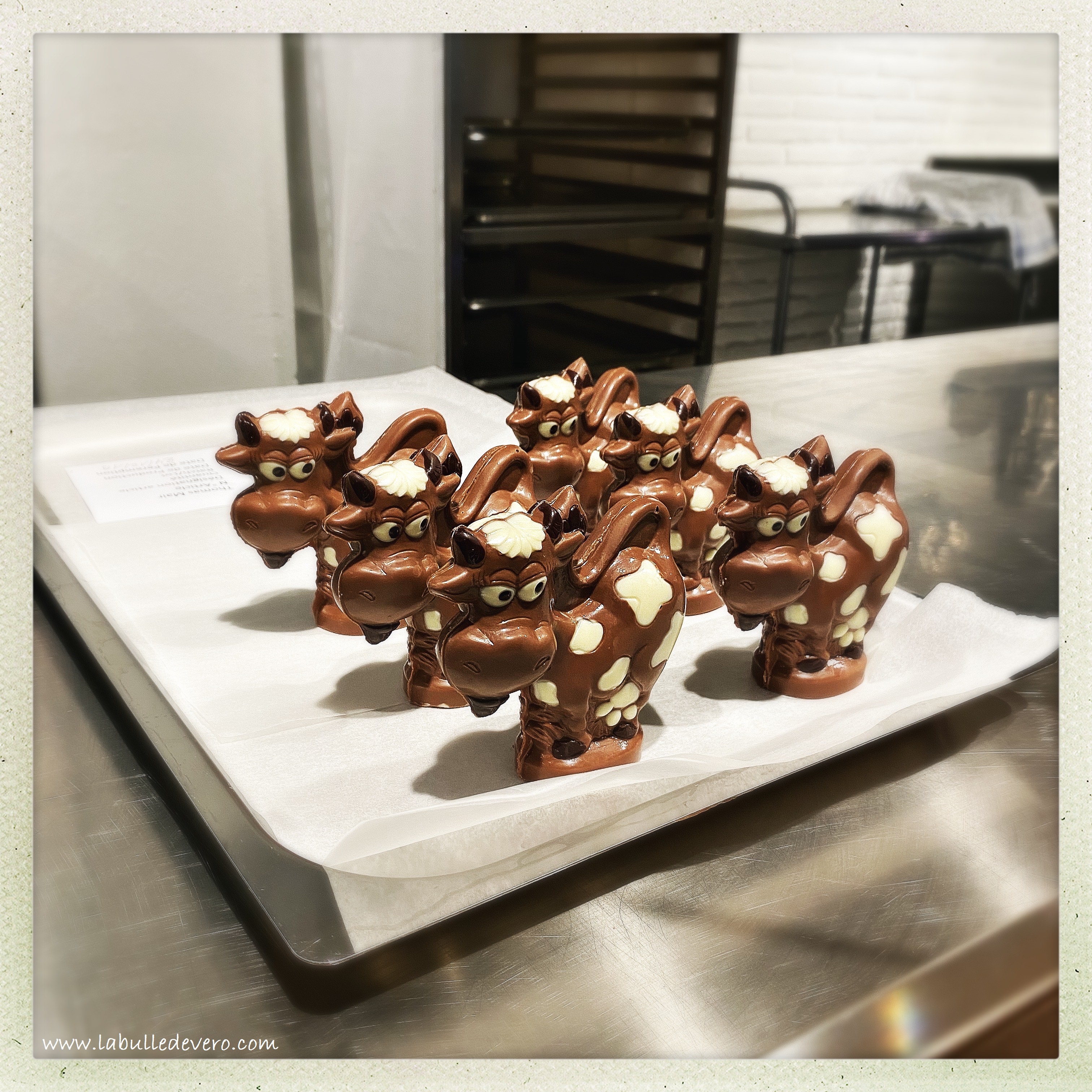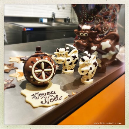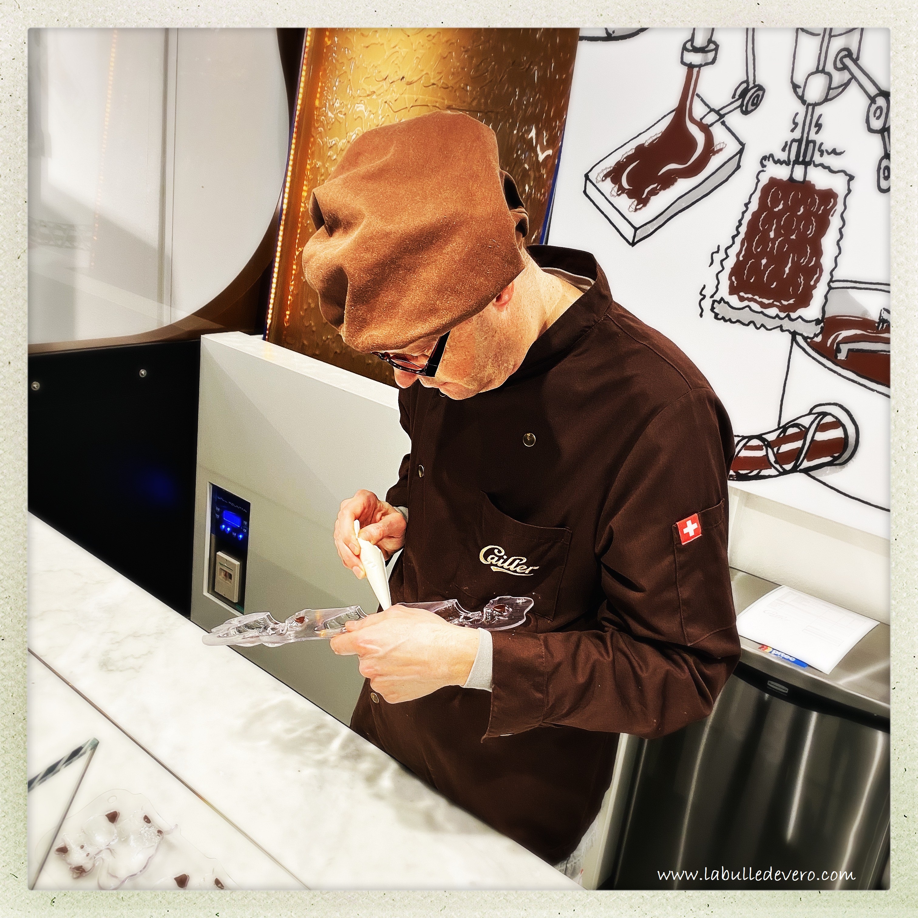 Nous avons aussi découvert comment les artisans participaient à la création des chocolats comme ce monsieur qui faisait les taches des vaches!
