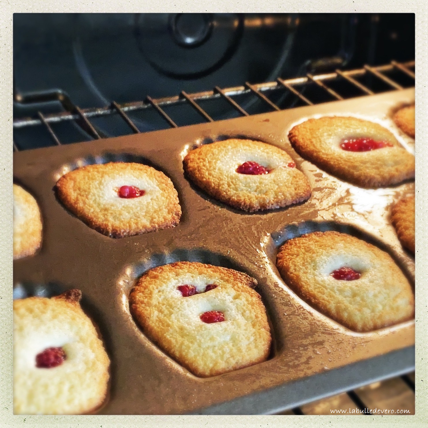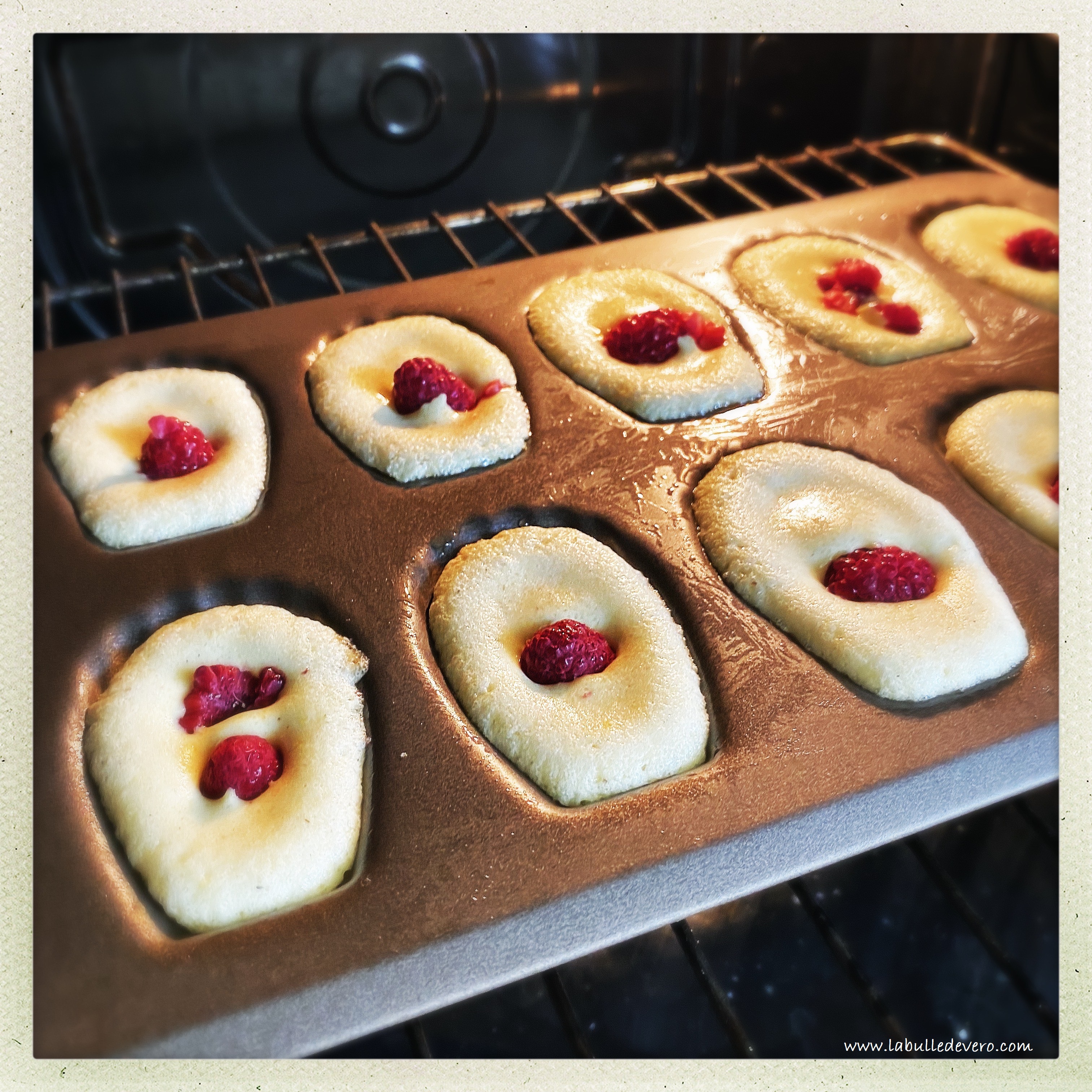 C’est tout. Il suffit ensuite de remplir le moule à madeleine au 2/3 et d’y planter une framboise au centre. J’ai utilisé des framboises congelées pour cette recette. 7 minutes au four à 210 degrés et c’est prêt. Une recette facile, rapide et gourmande pour finir les vacances sur une touche festive.