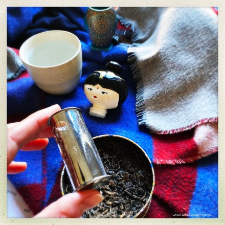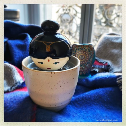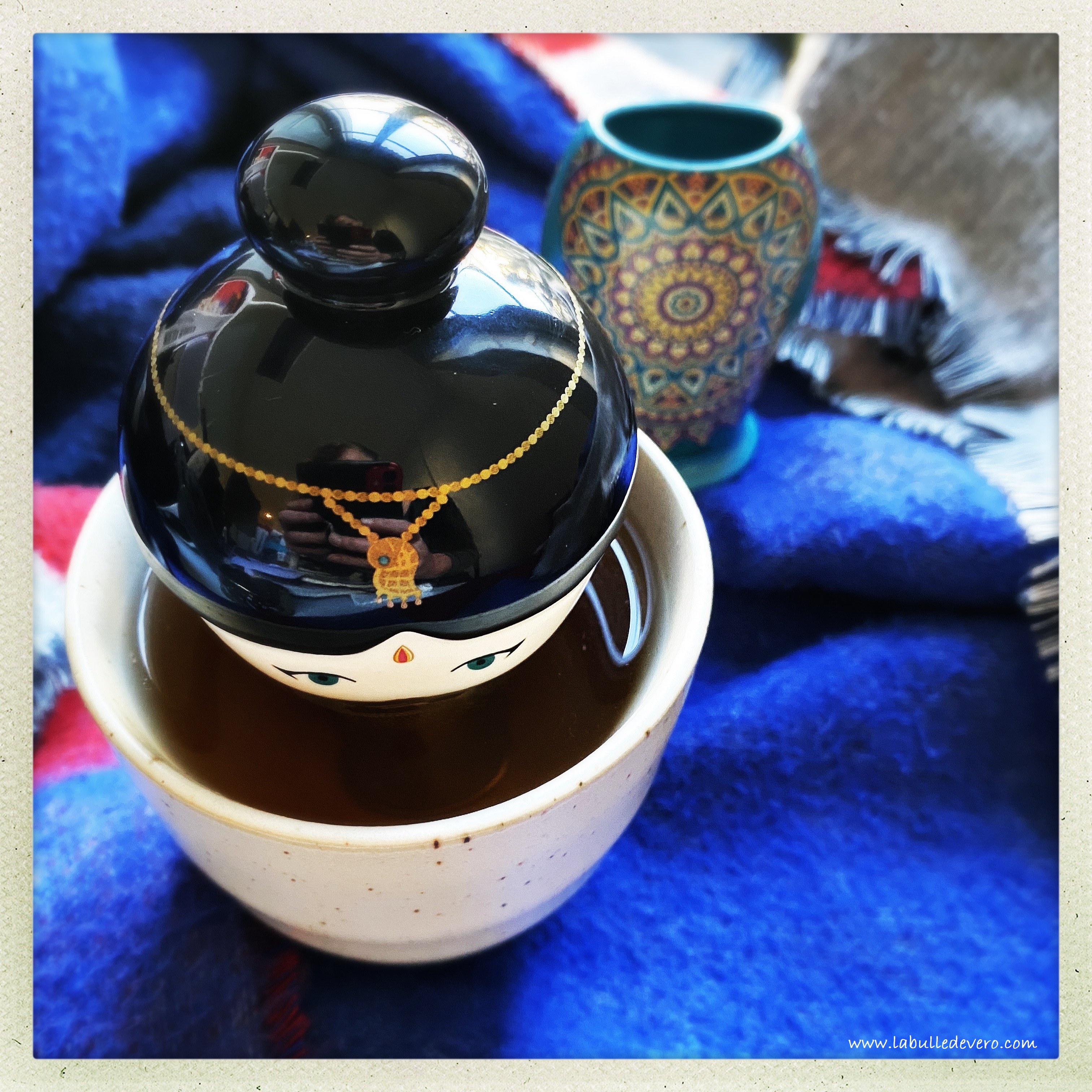 Il s’agit d’une mignonne petite Geisha en céramique qui se démonte pour qu’on puisse y glisser quelques feuilles de thé! Cette étape passée, on plonge sa tête et son tube dans l’eau bien chaude!