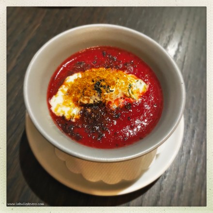 Nous avons débuté avec une petit velouté de betterave. Bon… je déteste la betterave, donc j’ai un peu froncé du nez quand la soupe est arrivée, mais c’était vraiment hyper bon – et si je vous le dis, vous pouvez me croire! Ce fut une excellente entrée en matière.