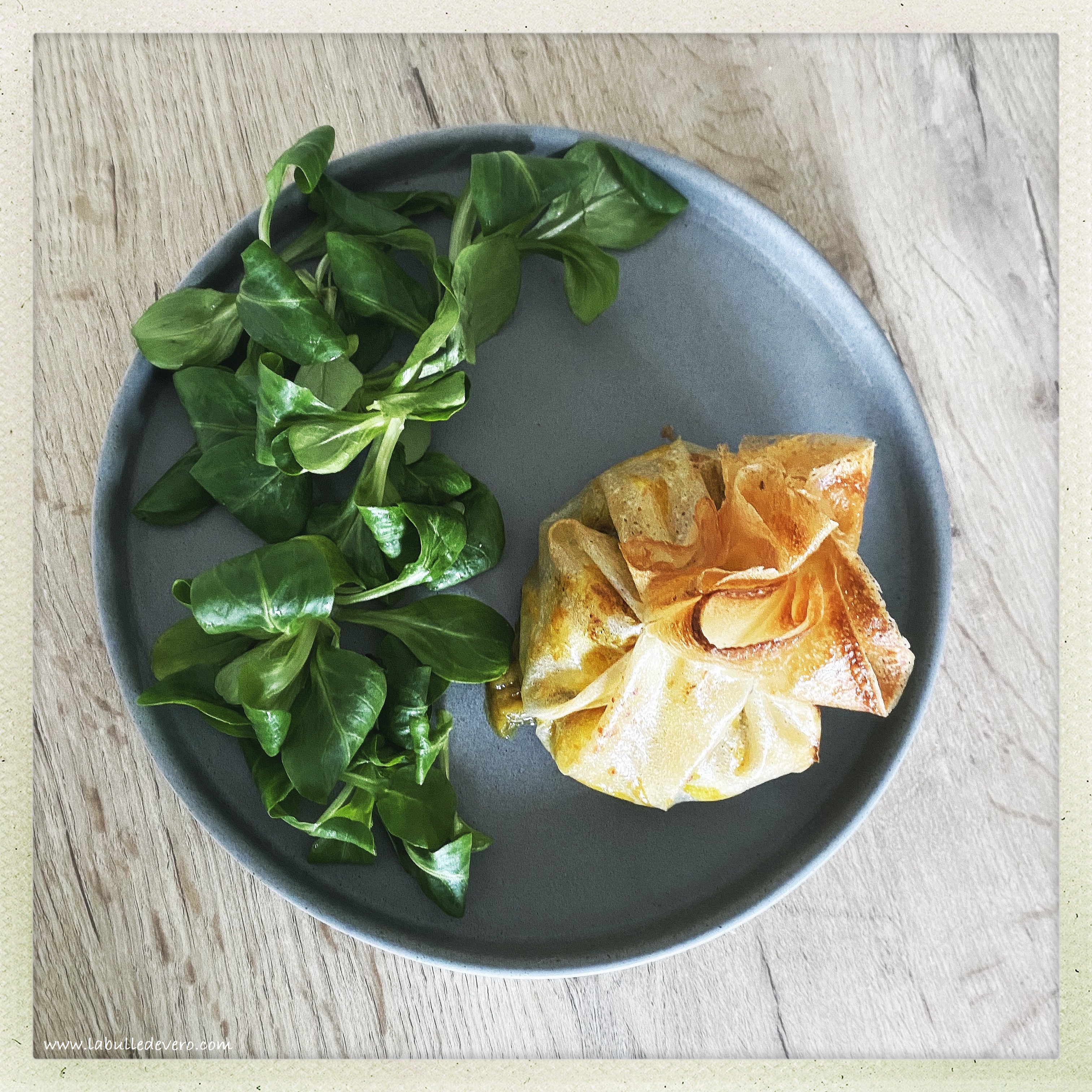Il ne reste plus qu’à servir. Je vous recommande de servir ces aumônières avec de la salade, de la doucette suisse par exemple qui est de saison. Vous allez vous régaler!