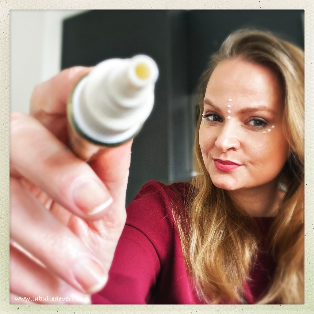 Ce soin est donc prévu pour les peaux de plus de 40 ans et sa particularité est de contenir du rétinol pur pour booster la production de collagène pour combattre ces rides d’expressions ou de mimiques qu’on ne veut pas faire disparaître – car on n’efface pas l’histoire – , mais dont on ne veut pas favoriser le développement! Il faut utiliser ce soin en dernière étape de notre routine et l’appliquer avec soin et surtout régulièrement pour voir des effets apparaître ou plutôt disparaître! En plus, cette gamme sent super bon! J’ai vraiment bon espoir qu’avec un peu de persévérance, ma ride du lion reste une ride de lionceau!