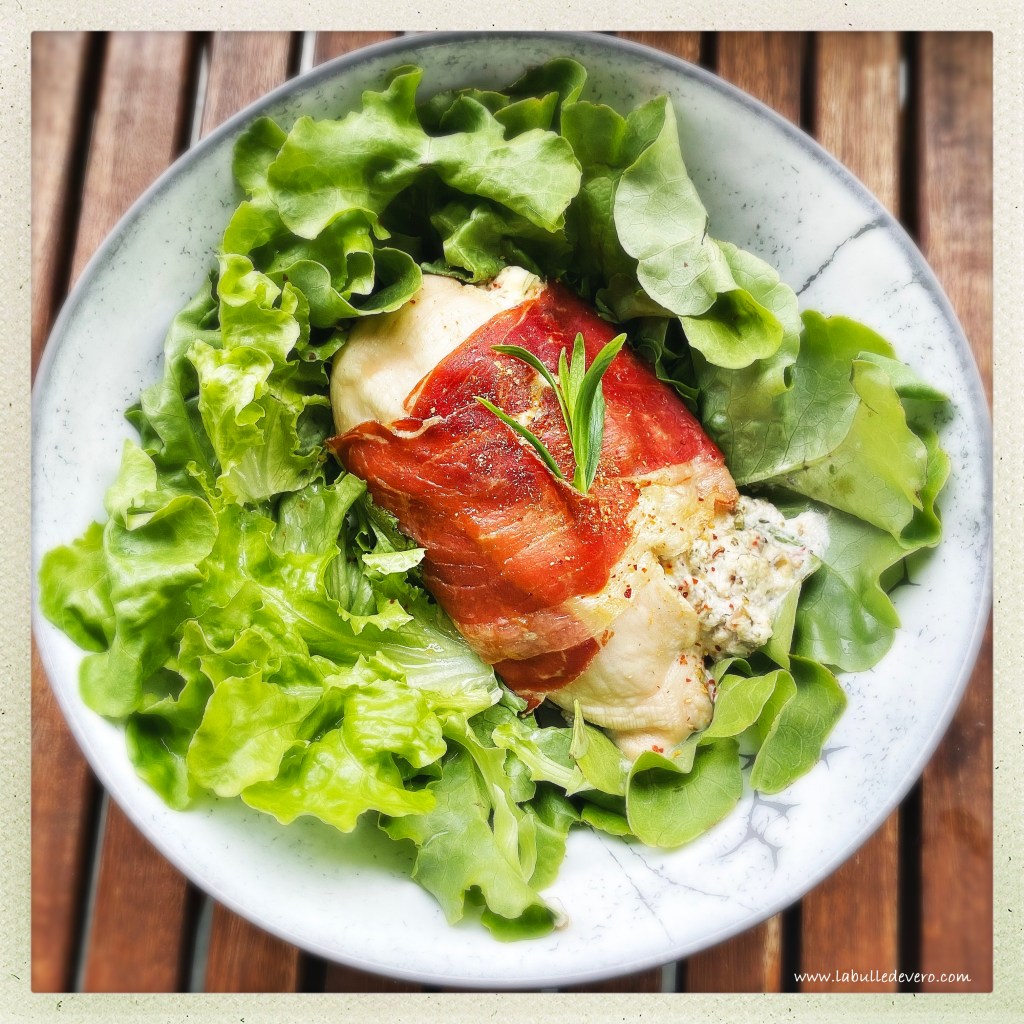 Ensuite, il faut couper les blancs de poulet dans l’épaisseur pour former un poche. Remplissez cette poche de la préparation au fromage blanc. Enroulez ensuite chaque escalope d’une tranche de jambon crû. C’est déjà tout!