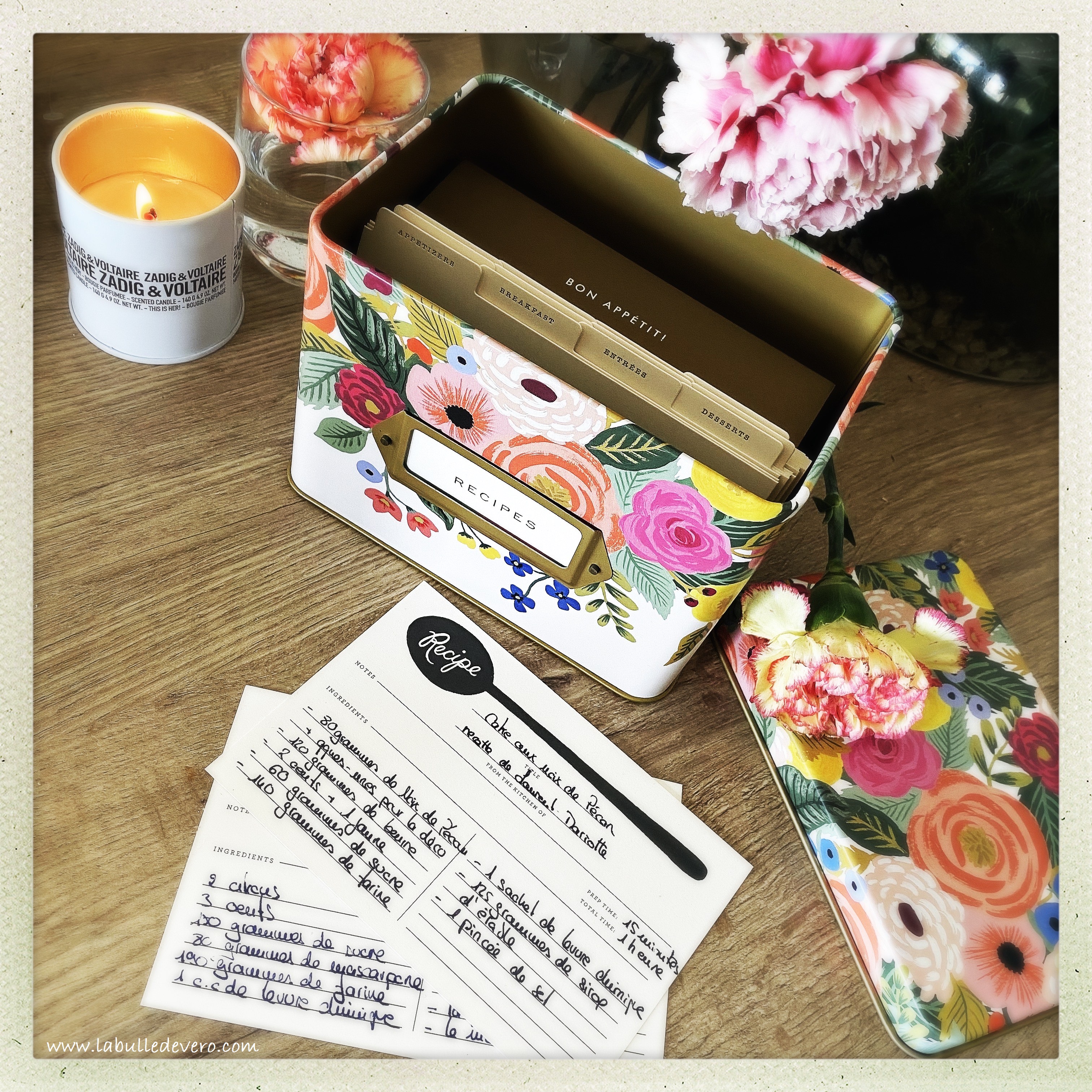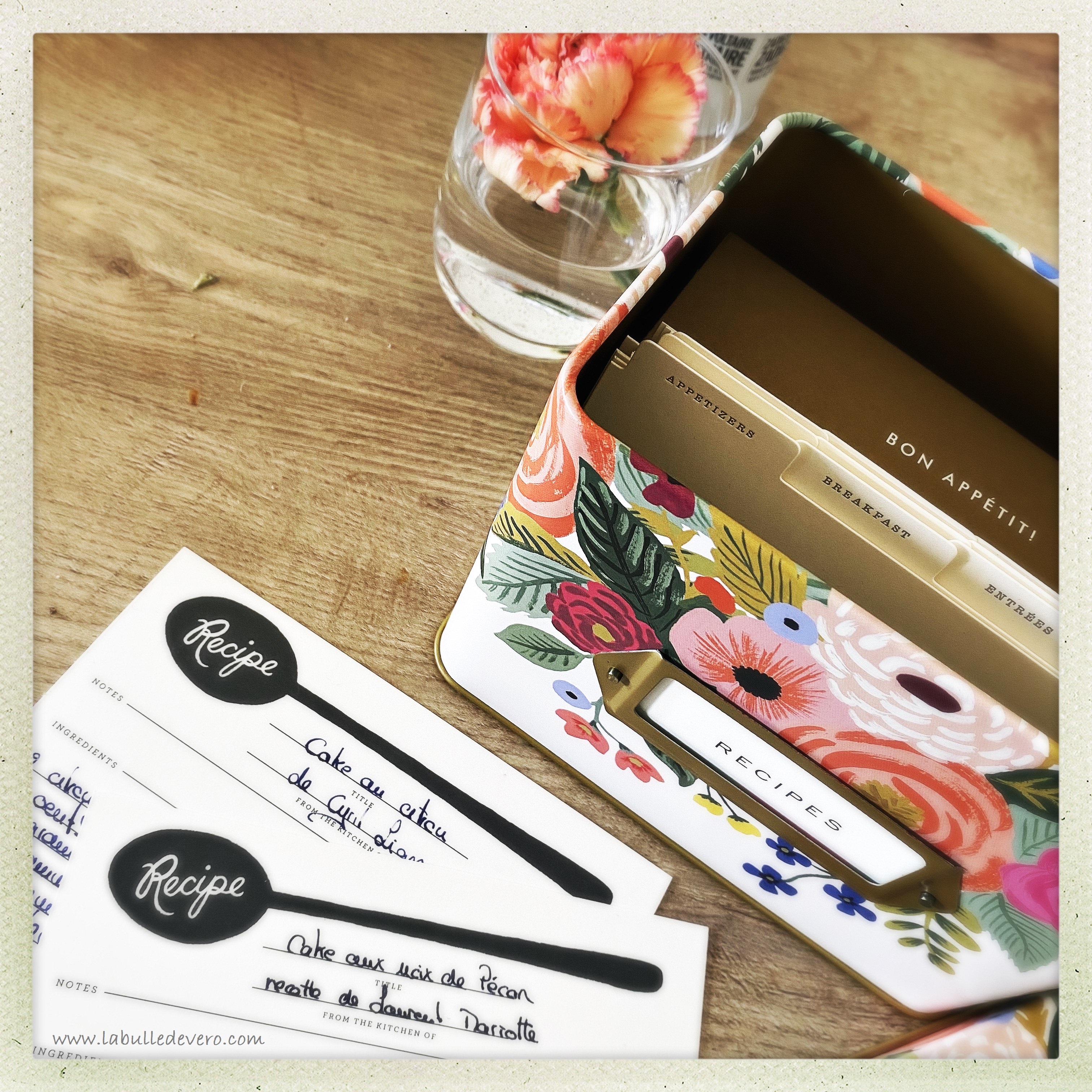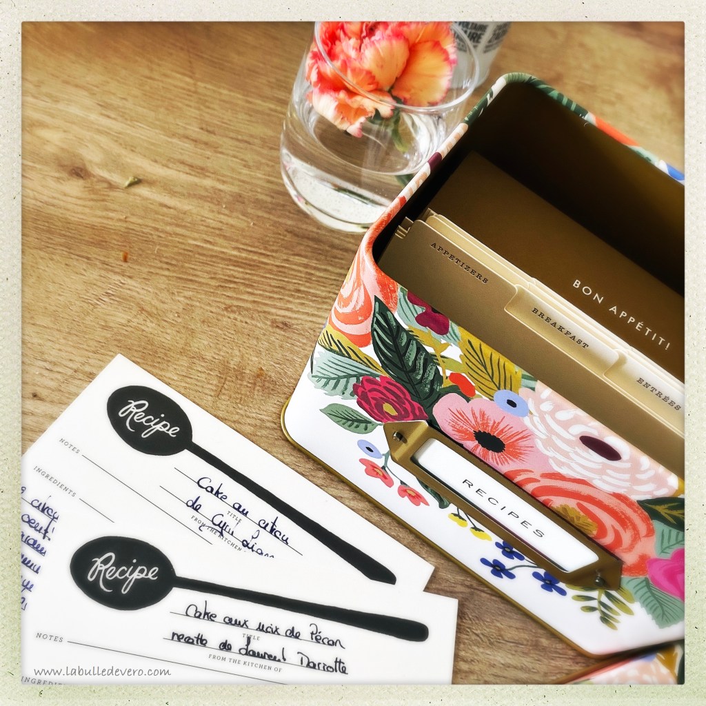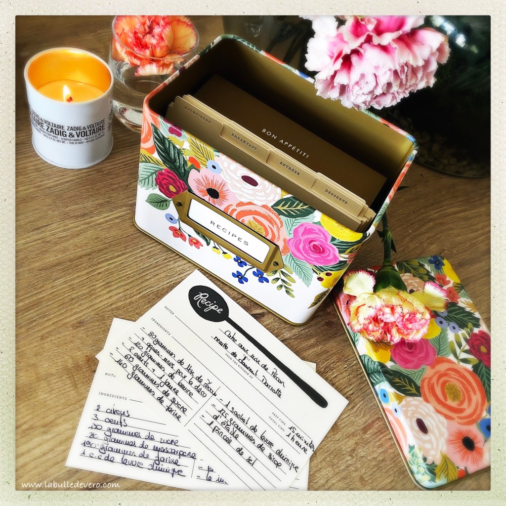 Comme vous le savez, j’aime beaucoup cuisiner, mais surtout ce que j’aime, c’est essayer de nouvelles recettes. J’en partage avec vous celles qui sont bonnes, je garde pour moi celles qui le sont moins. Mais quelques fois, il y en a qui sont vraiment incroyables. Pour les conserver et les retrouver facilement, j’ai acheté cette petite boite de Rifle Paper Co. chez Nath & Jules.