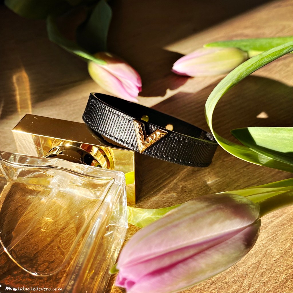 Ce bracelet est composé d’une lanière en cuir texturé et est orné d’un V doré et guilloché comme Véro ou comme Vuitton – à vous de choisir, mais moi, je dis Véro! Un bracelet qui s’associe bien aux bracelets fins que je porte au quotidien! Merci à ma super équipe Shiseido pour ce magnifique cadeau qui va me suivre partout!