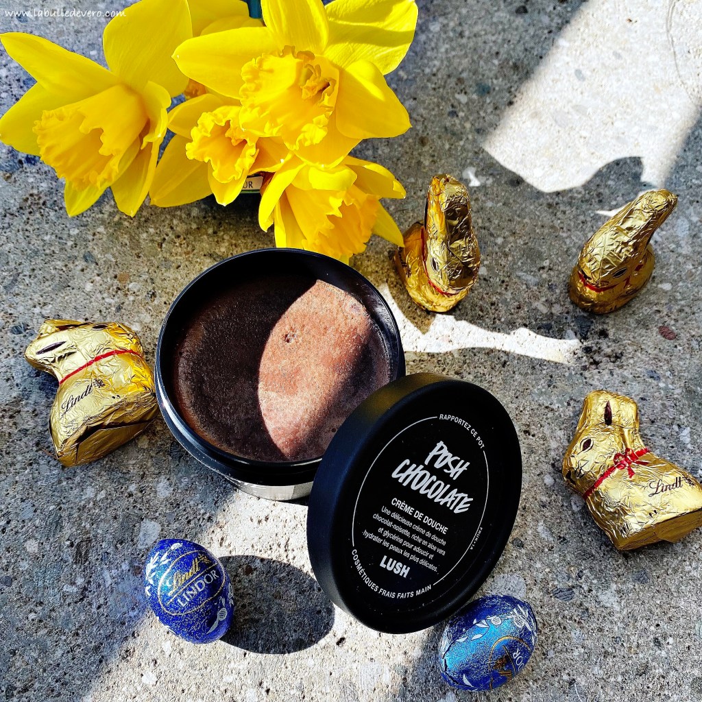 Pour que ce sentiment de réconfort soit encore plus fort, j’ai utilisé la crème de douche Posh Chocolate de Lush. Cette fragrance de cette crème nettoyante est incroyable! Elle sent comme la mousse au chocolat! Un truc de dingue!