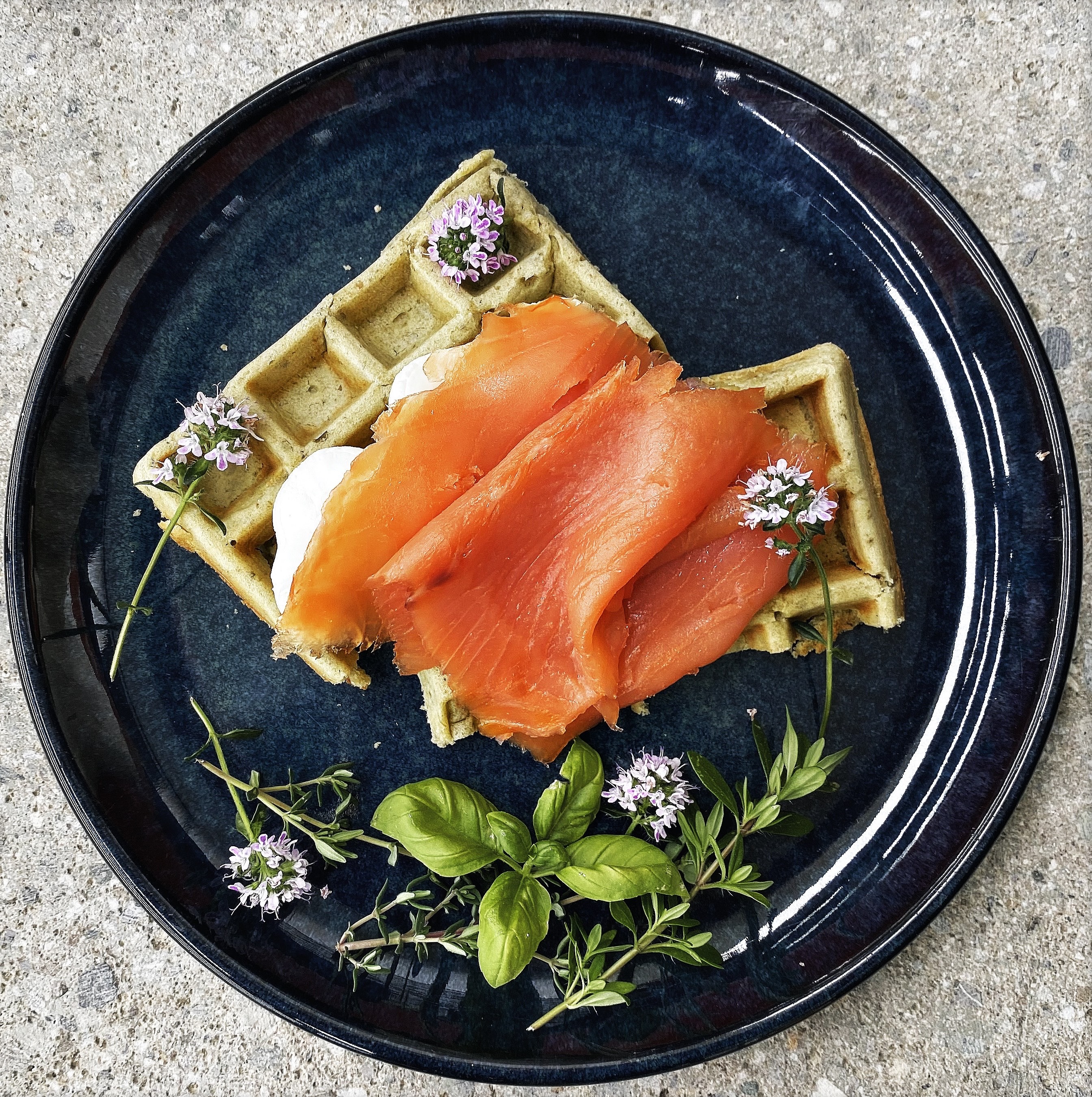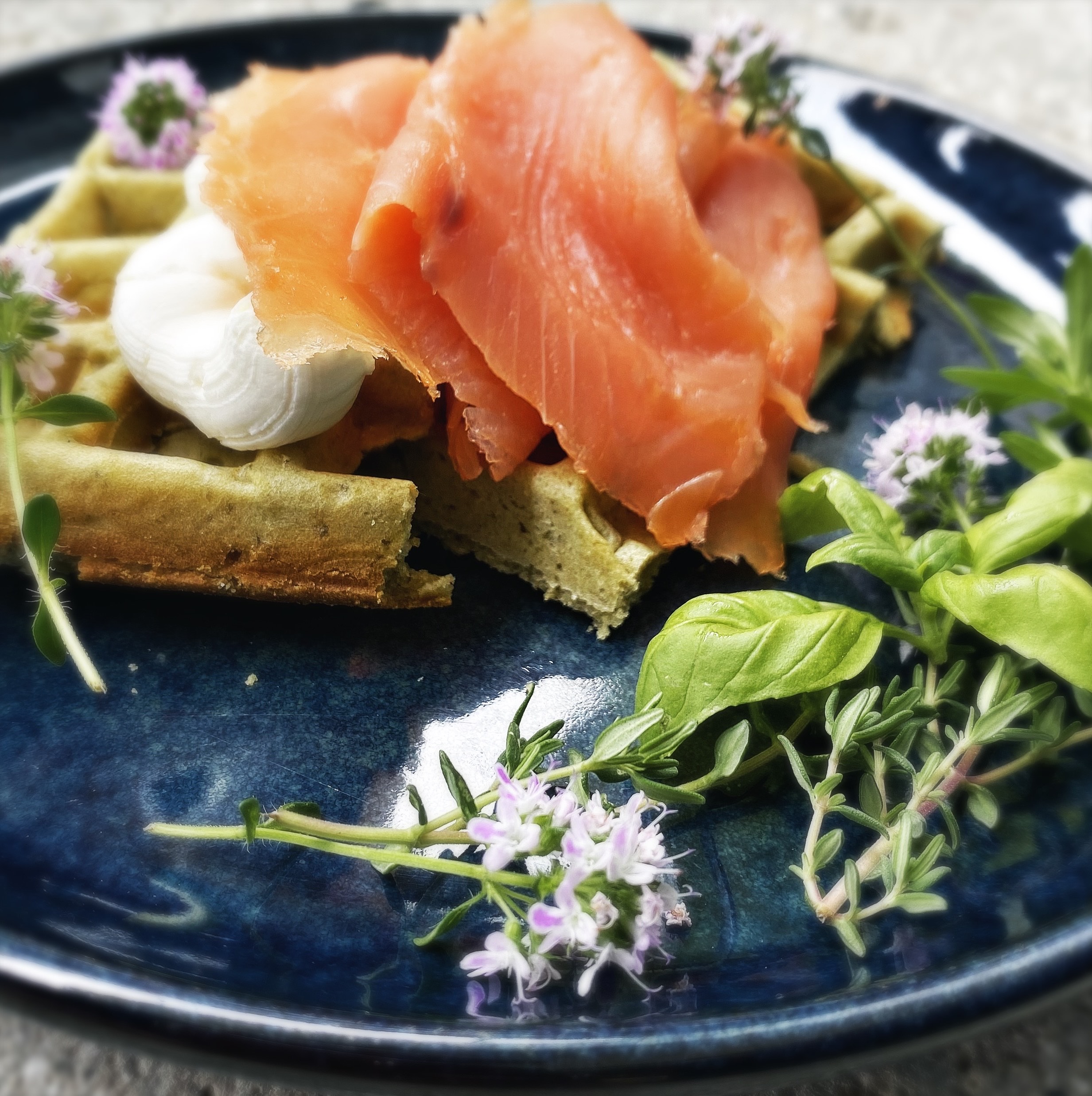 Lorsque les gaufres sont cuites, il ne reste plus qu’à dresser avec un peu de fromage frais, le saumon, un zeste de citron et des petites herbes fraiches.
