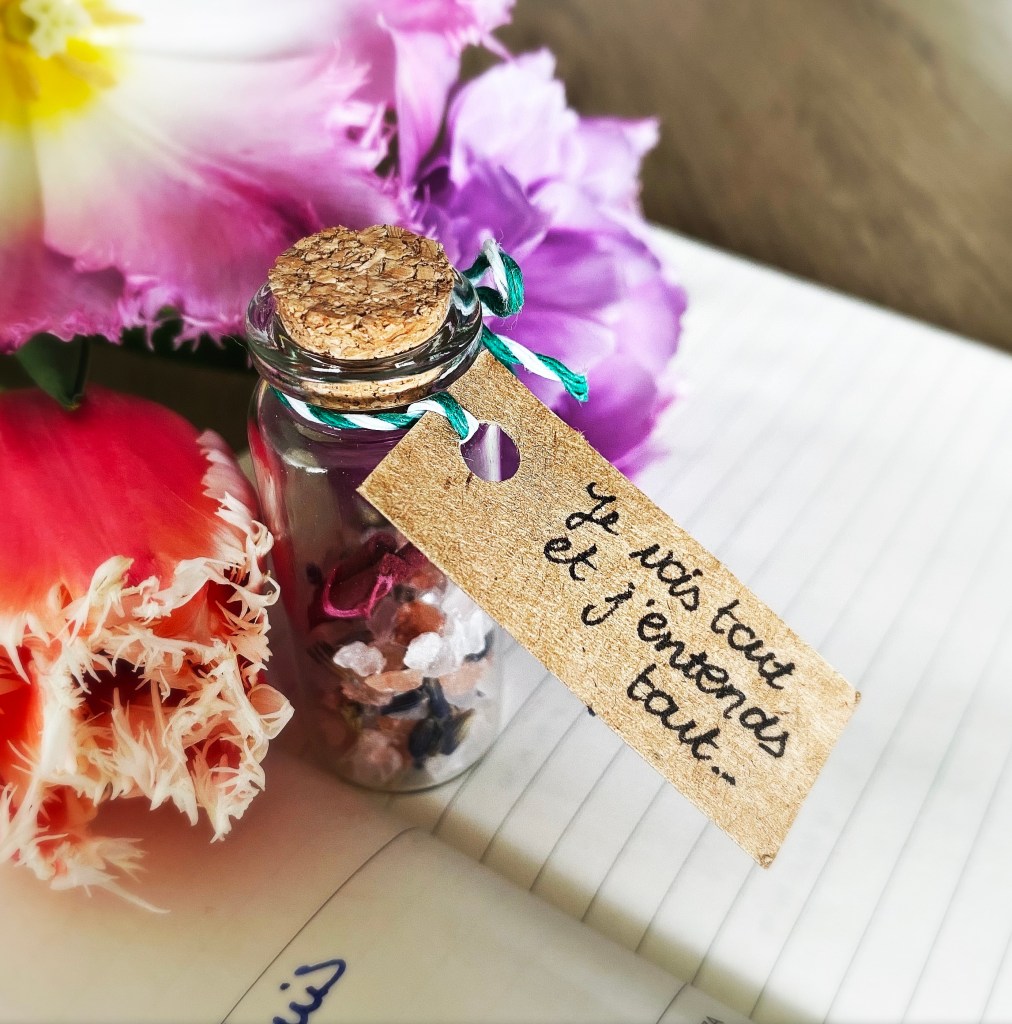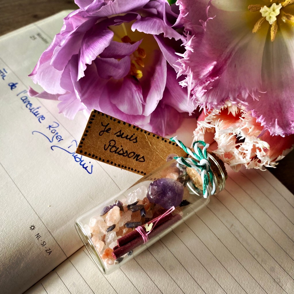 Pour les poissons, comme moi, la fiole contient une améthyste, du sel rose d’Himalaya, des fleurs de lavande, de l’encens et une goutte d’huile essentielle de lavande pour rester bien zen. La fiole se ferme avec un bouche de liège et comporte une étiquette avec une caractéristique de mon signe: Je vois tout et j’entends tout… C’est le propre du Poissons et c’est pour cela que nous sommes si sensibles (et cette sensibilité n’est pas toujours un cadeau).