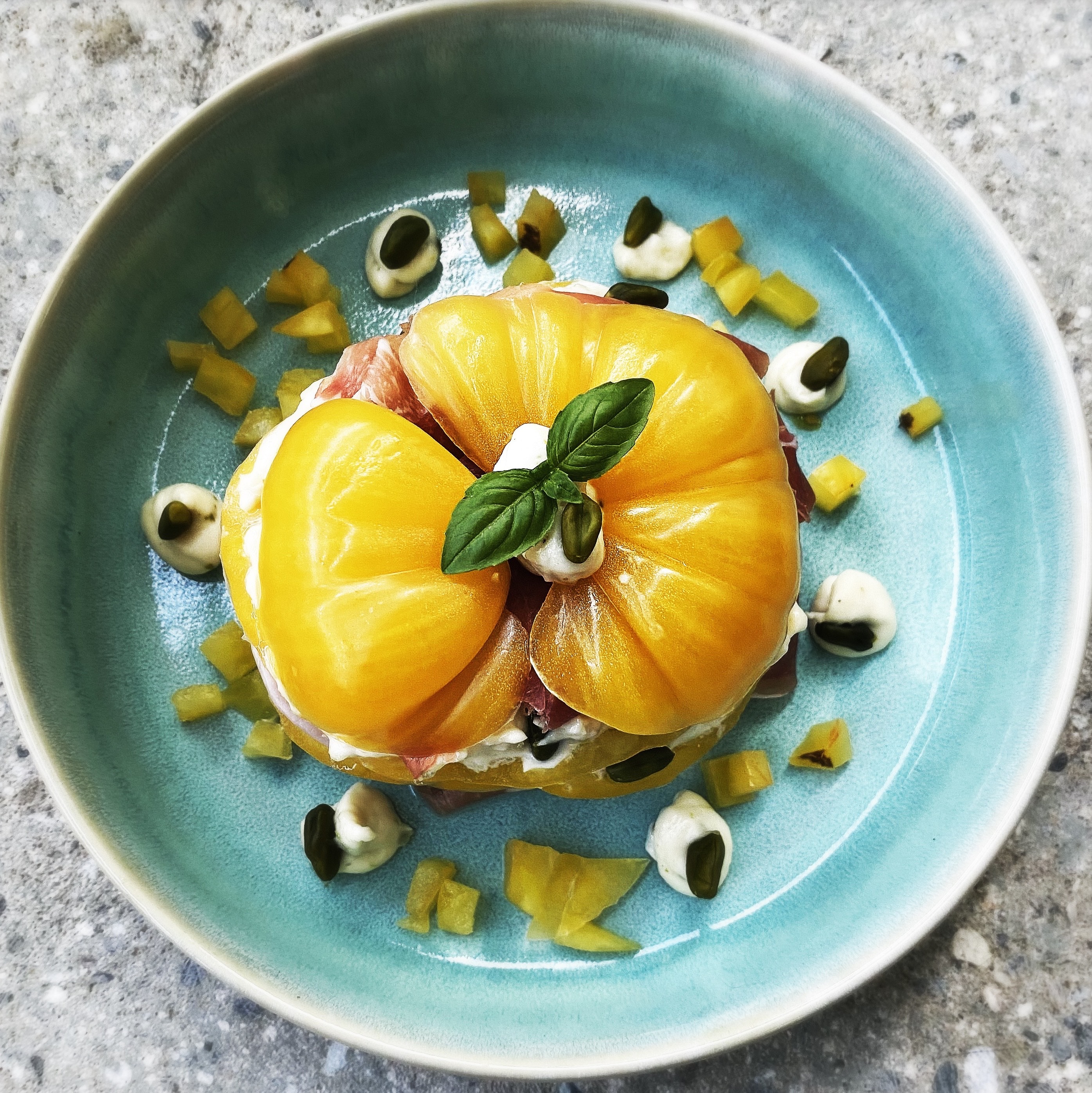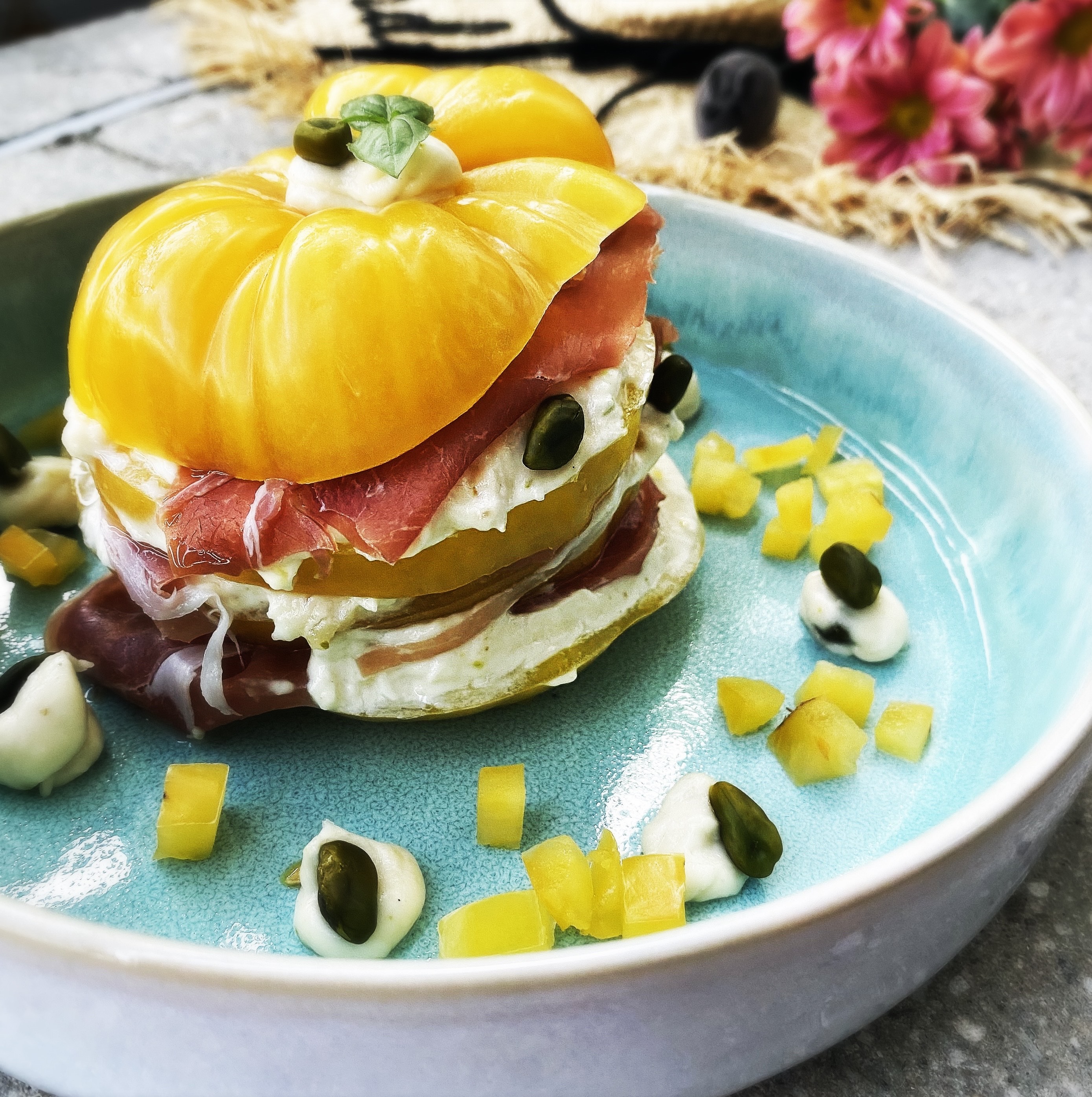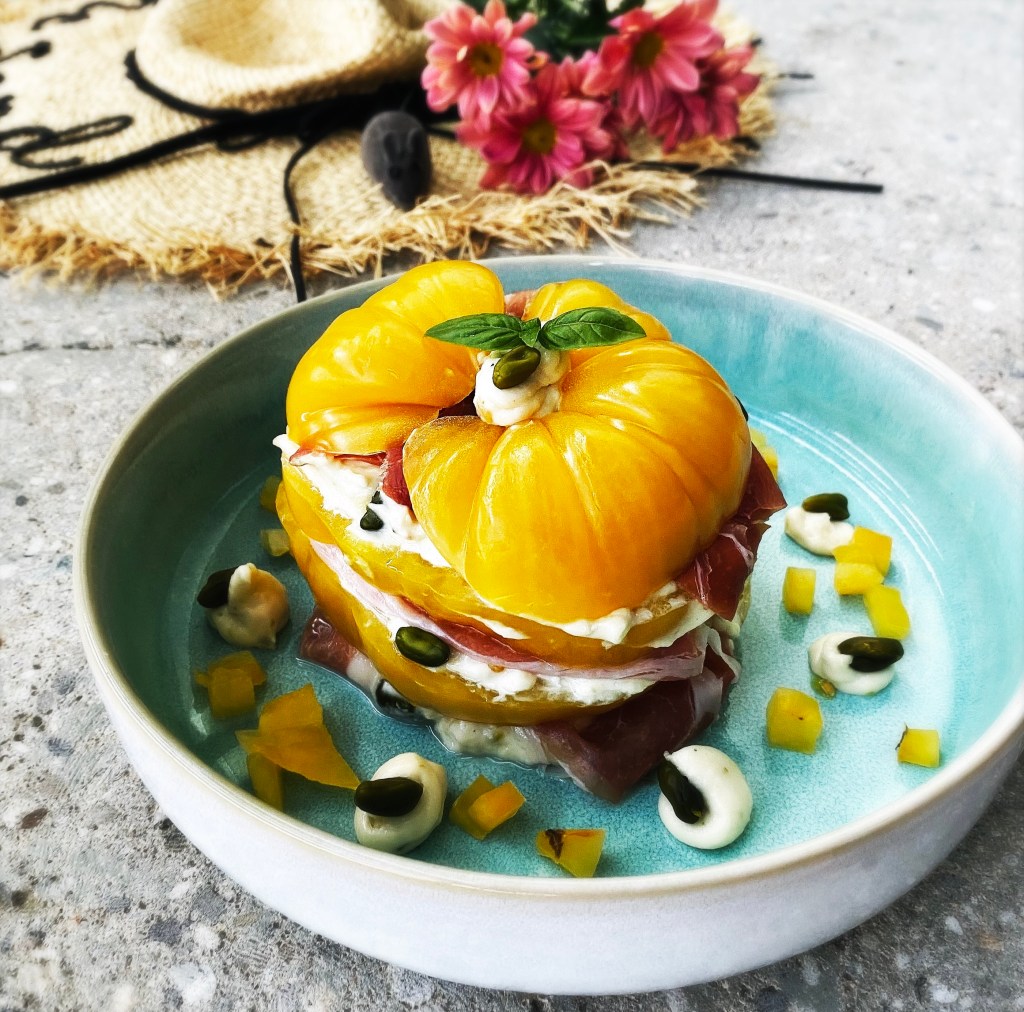 Ce week-end j’ai tenté une nouvelle recette estivale que j’ai trouvée dans le magazine Marmiton: Le millefeuille de tomate au jambon crû et crème de mozzarella. Une recette facile à réaliser, mais avec des ingrédients un peu plus rare comme la purée d’amande ou l’huile de pistache (J’ai trouvé ces ingrédients chez Globus). Cela nécessite donc un peu d’organisation au niveau des courses, mais le résultat en vaut la peine! Pour cette recette et pour 4 personnes, il vous faudra 4 grosses tomates bien mûres (peu importe la couleur), 12 tranches de jambon crû, 1 gousse d’ail, 1 boule de mozzarella, 4 cuillère à soupe d’huile de pistache, 2 cuillères à soupe de pistaches nature décortiquées, 2 cuillères à soupe de purée d’amande blanche et 2 cuillères à soupe de vinaigre balsamique blanc.