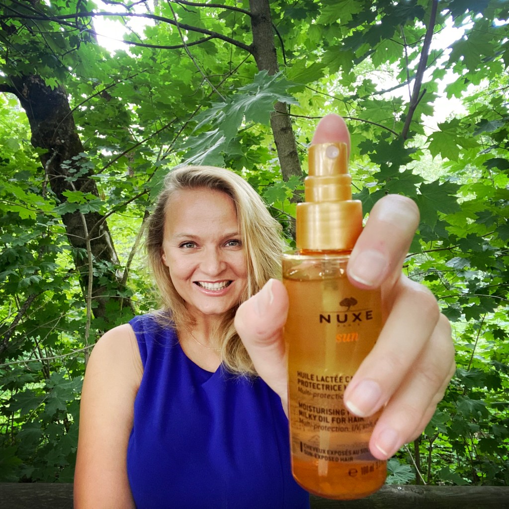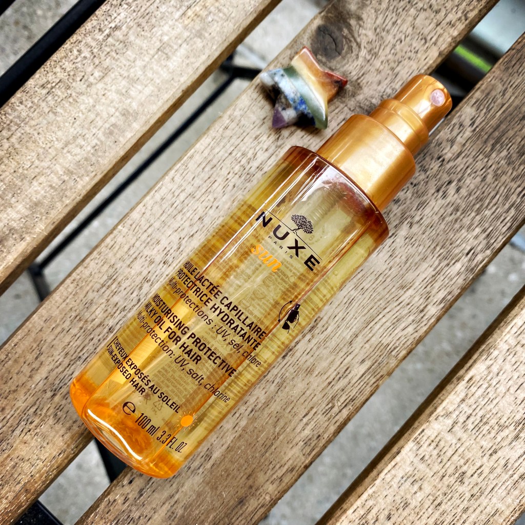Soleil + eau = cheveux en bataille! Alors je ne vais pas me plaindre, parce que je trouve cela plutôt sympa que je me cheveux s’éclaircissent et aient plus de volume, mais dans la mesure où nous sommes au mois de juin et que j’ai bien l’intention de barbotter tout l’été, il faut que je les protège aussi et pour ce faire, j’utilise en ce moment l’huile lactée capillaire protectrice hydratante de Nuxe.