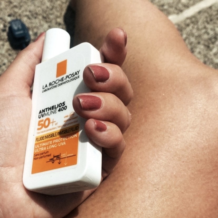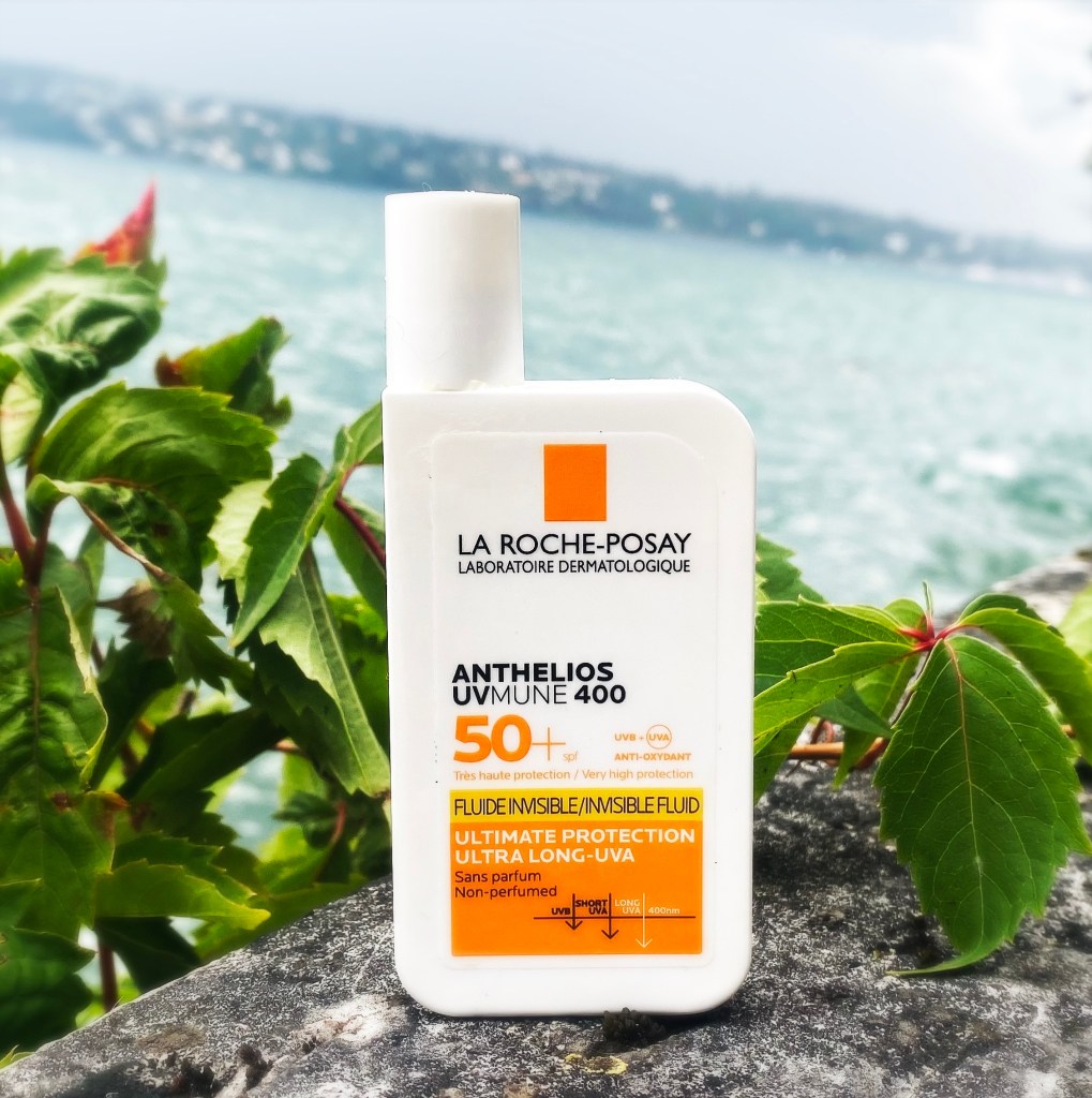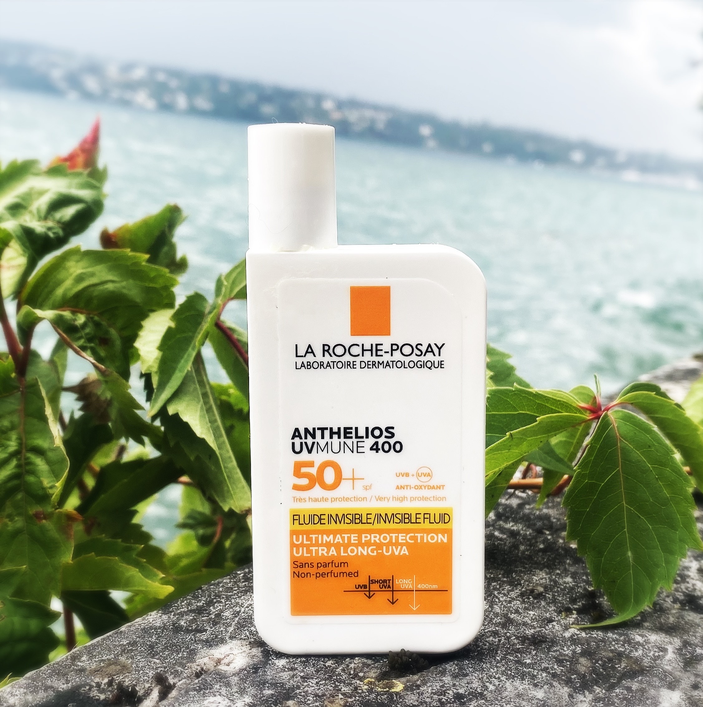Aujourd’hui, j’avais donc mis dans mon sac de piscine le fluide solaire de La Roche-Posay: Anthelios UVMUNE 400. Sa particularité, c’est d’être un fluide, donc une texture vraiment liquide qui s’applique vraiment très facilement sur le visage ou sur le corps. Je dois dire que c’est une texture invisible très agréable, car pas grasse du tout. Elle convient donc aux jours de piscine, mais aussi pour les terrasses et la vie quotidienne.